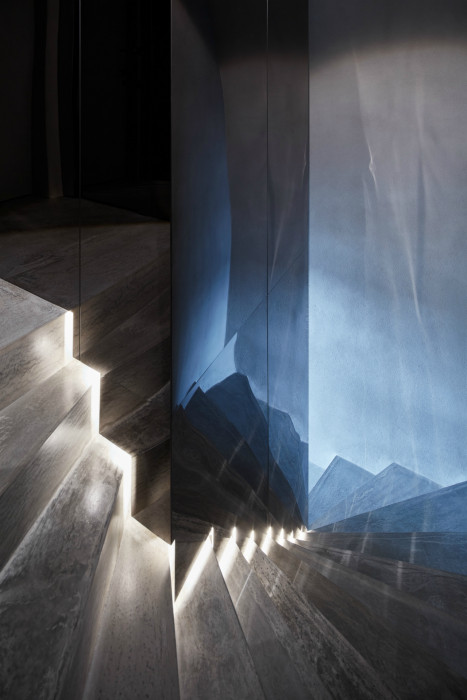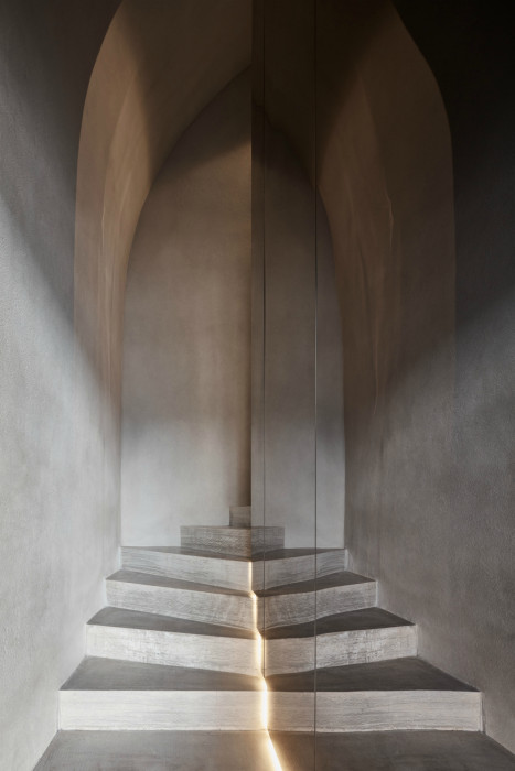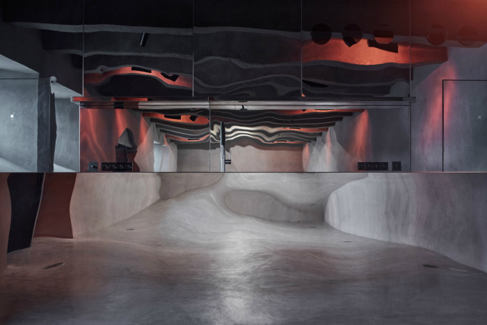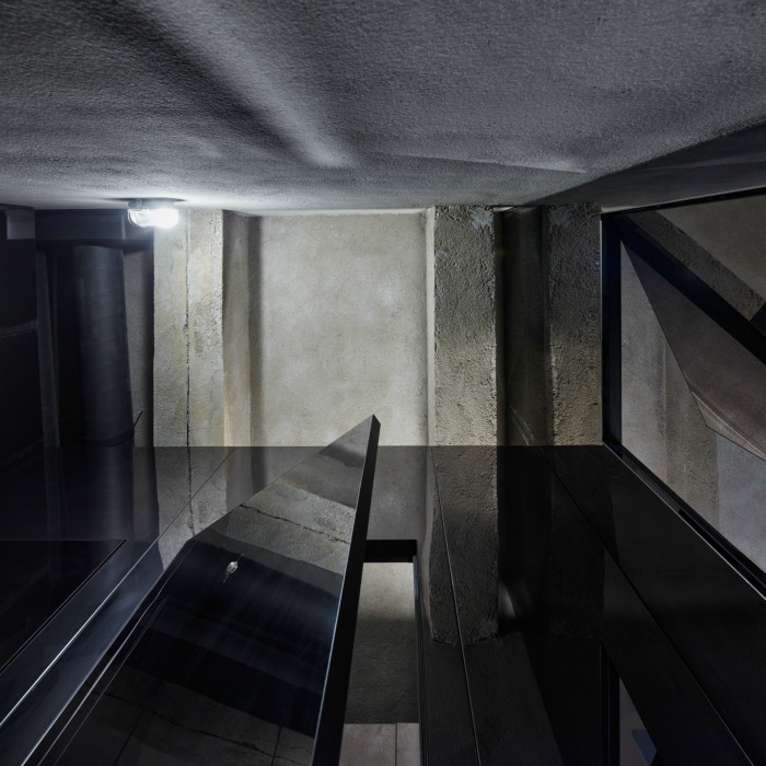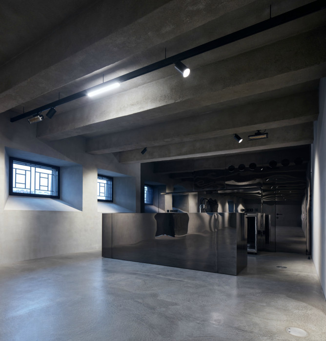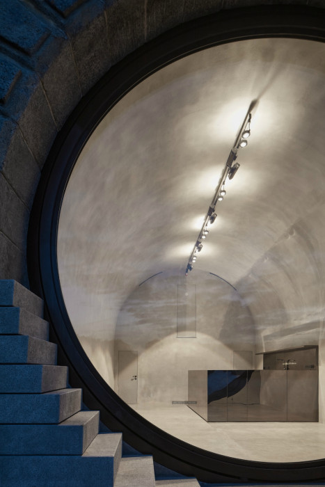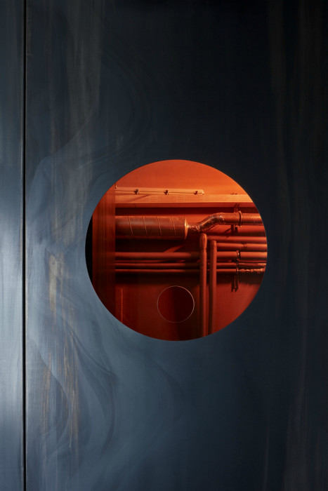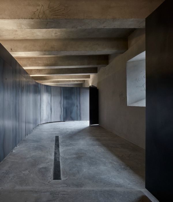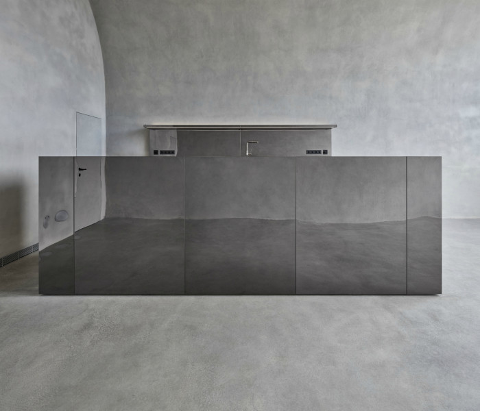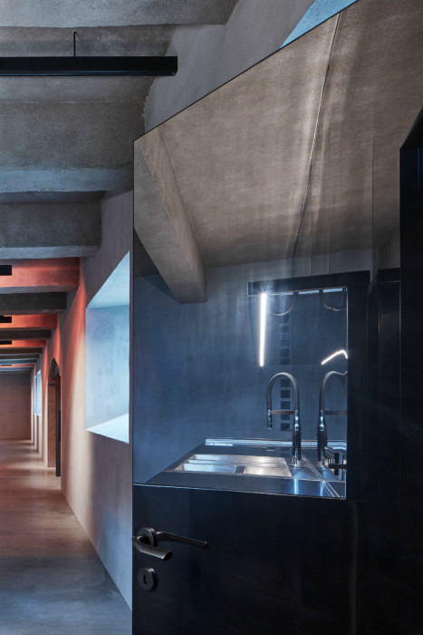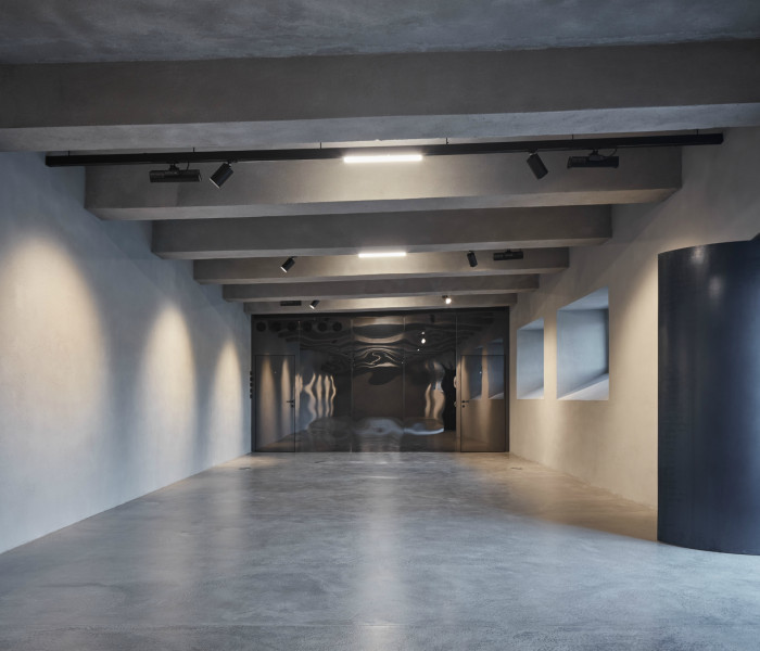 Výrazové řešení kobek je sjednoceno pro všechny typy prostor a promítá se do materiálového zpracování jednotlivých prvků realizovaného souboru. Povrchy stěn a stropů jsou řešeny jako betonové pískované s litou betonovou stěrkovanou podlahou přecházející do litého monolitického schodiště. Prvky dveří poklopů a šachet jsou opatřeny zaomítacími a zastěrkovacími křídly s povrchy odpovídajícími navazujícím povrchům stěn a podlah (pískovaný a stěrkovaný beton a impregnovaná černá ocel u WC kobek). Dveře jsou řešeny jako bezfalcové se skrytými samozavírači. V klenutých kobkách jsou do povrchů vsazeny inserty pro zavěšování výstav. Vložené prvky barů a příček v zázemí jsou opláštěny černým zrcadlovým potitanovaným plechem prostorově doplňujícím odrazem prostorovou geometrii kobek a přenášejícím fluidní neuchopitelnost řeky dovnitř neustálým těkavým pohybem odrazu. Osvětlení je řešeno pomocí páteřních světelných ramp s reflektory a infrazářiči, u WC kobek jako nepřímé vložené v ocelové stěně s odrazem světla od stropu.