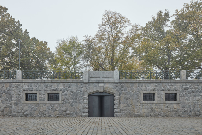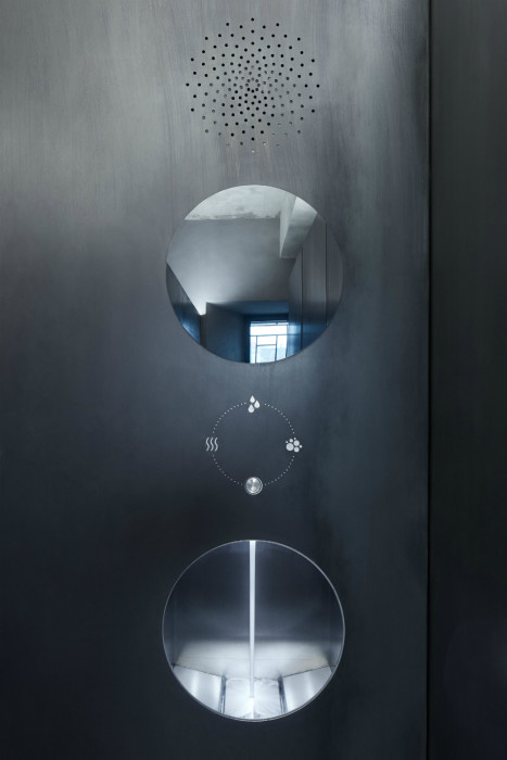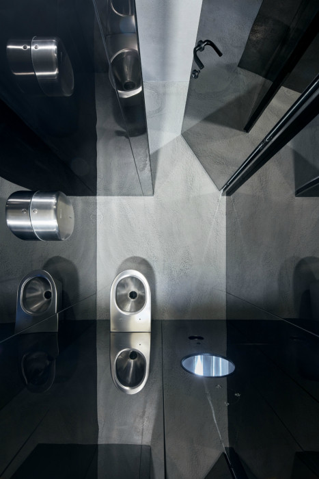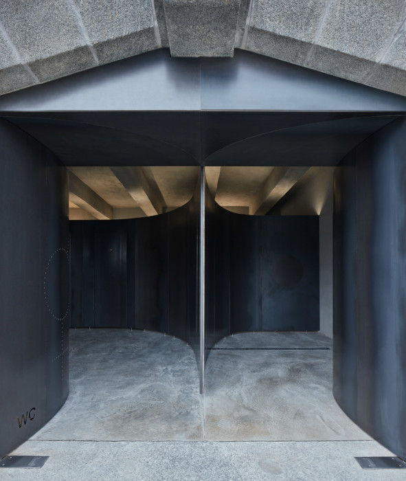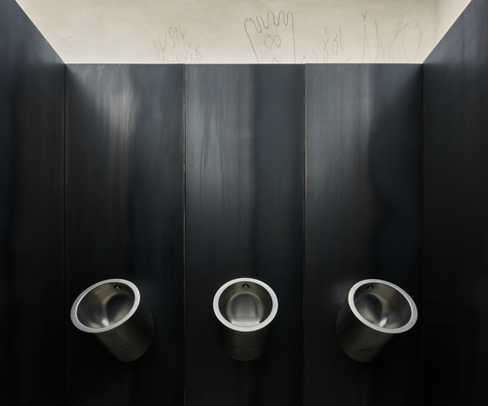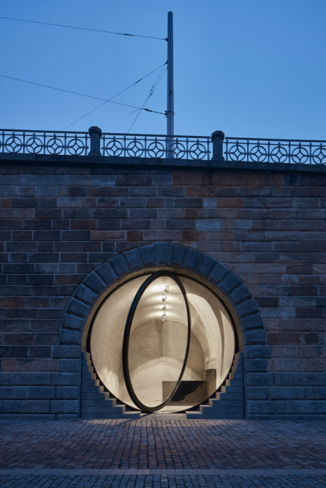 Vstupy do čtrnácti kobek na Hořejším nábřeží jsou tvořeny ocelovými skulpturálními dveřmi prohnutými do ostění tak, aby při otevření propojovaly kobku s náplavkou v celém průřezu. V kobkách s veřejnými toaletami přechází tato vstupní křídla plynulým obloukem do interiérové membrány oddělující kabiny od veřejného předprostoru.