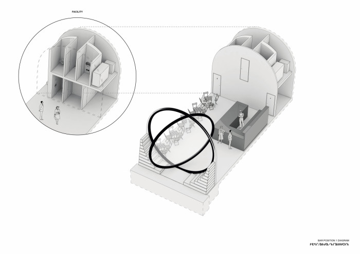 Kobky budou sloužit jako kavárny, kluby, ateliéry, dílny, galerie, pobočka knihovny, prostory pro sousedská setkávání a veřejná WC. Architektonické řešení pracuje s modulární diverzitou, prostory jsou dotaženy do detailně propracovaného základu včetně veškerého provozně technického zázemí a barových korpusů přemístitelných do několika pozic. Je předem zpracován uživatelský manuál obsahující označování jednotlivých podniků a doplňování vestavných prvků (vložení patra do velkých kobek, exteriérový bar, atd.). Přitom je kladen důraz na možné doplnění každé z kobek tak, aby získala svou konzistentní integritu pomocí vybavení dle každého nájemce sedacím nábytkem a interiérovými prvky.