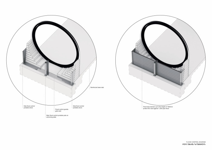 Architektonické řešení šesti kobek na Rašínově nábřeží je postaveno na doplnění geometrie portálů vyplývající z dochovaného tvaru ostění blížícího se kruhu. Samotné provedení je postaveno na lapidárním zásahu, který více odebírá, než přidává a navrací do prostoru jeho již dříve existující kvalitu v novodobém kontextu vytvářející unikátní situaci a příležitost. Řešení je postavené na vybourání tahokovových předstěn a kamenných „zátek“ vestavěných do původních mostních oblouků nábřežní zdi a jejich nahrazení velkoformátovými zasklenými kruhovými okny otvíravými v celé své ploše diagonálním otočením uvnitř rámu. Vstupní portály jsou řešeny jako atypické ocelové rámy s dilatačně usazenými skly o hmotnosti 1-1,5 t.