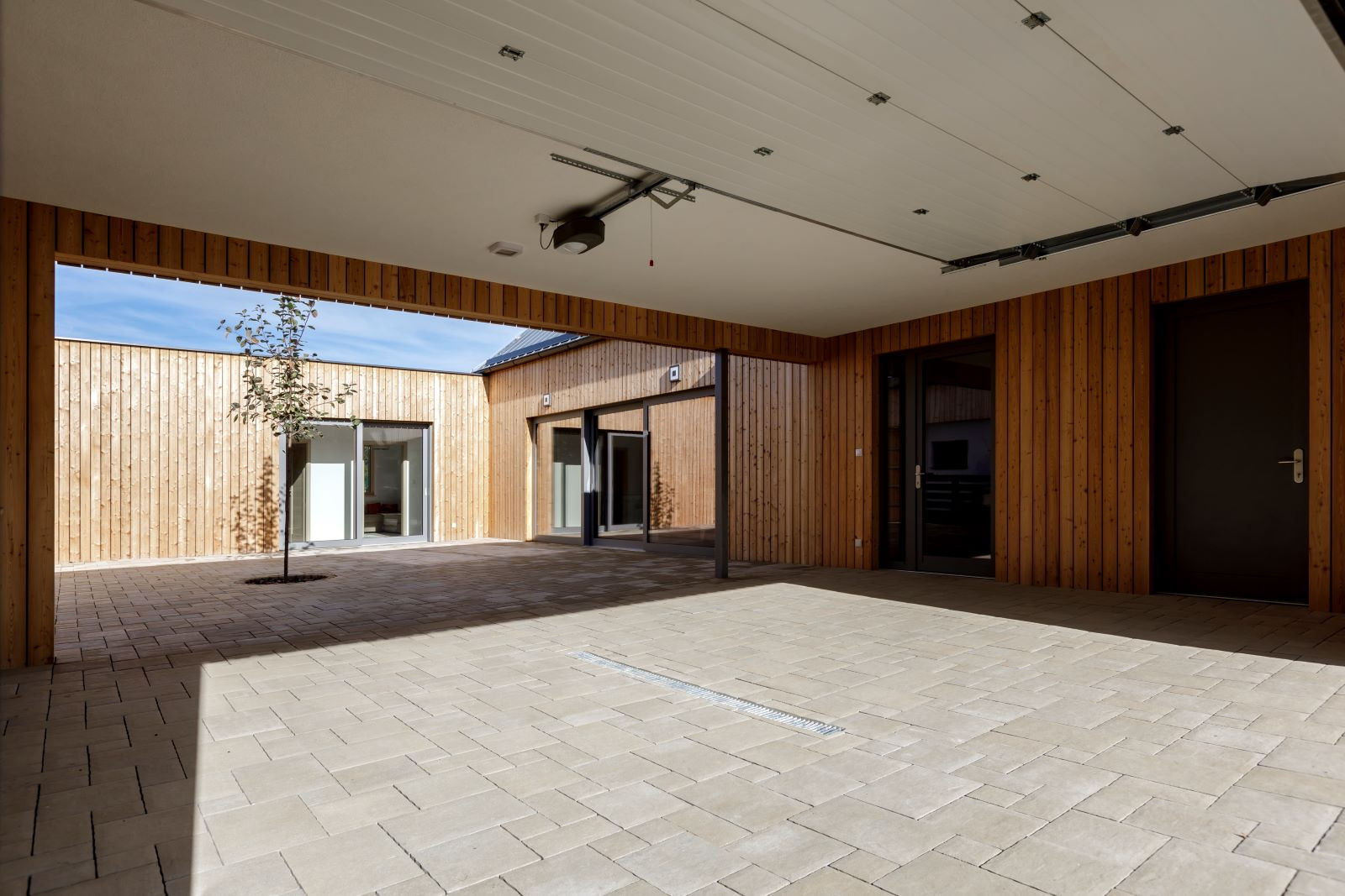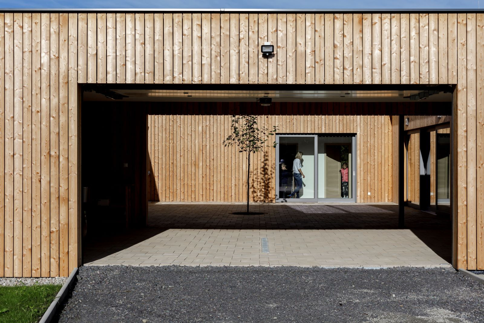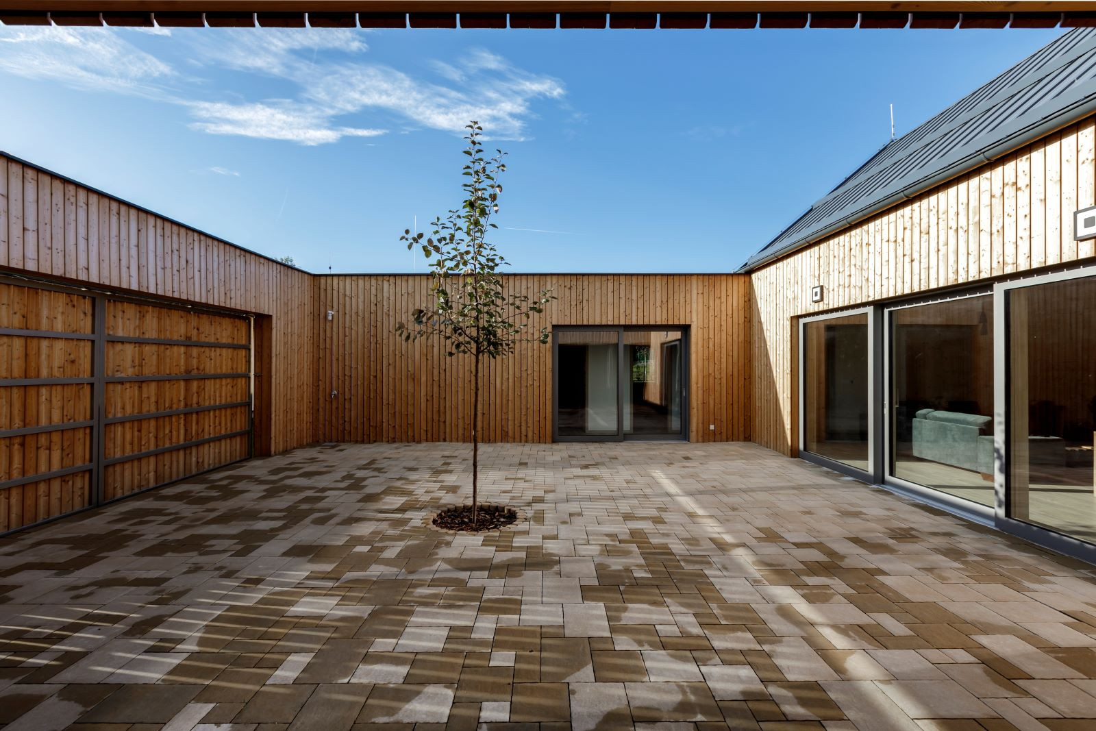 Úzky a dlhý pozemok s východno-západnou orientáciou, susediaci dom na hranici pozemku... Obytné krídla vymedzujú privátny priestor. Vzniká átrium, ktoré je zo všetkých strán clonené pevnými, alebo posuvnými bariérami. Vnútorný dvor sa tak v letných mesiacoch stáva stredobodom obytného priestoru. Denná časť domu je rozšírená o otvorené podkrovie.