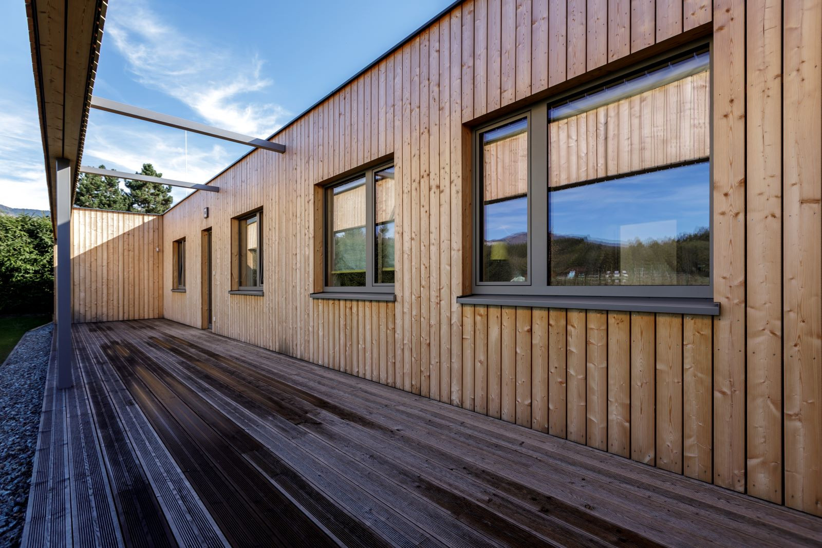 Výsledkom je jednoduché, prízemné, bezbariérové riešenie. Pokojné, lineárne hmoty ozvláštňuje silueta sedlovej strechy. Výborný je kontakt s okolím. Bývať sa dá nielen “dnu”, ale obytný priestor sa za dobrého počasia rozširuje aj na priľahlé vonkajšie plochy.