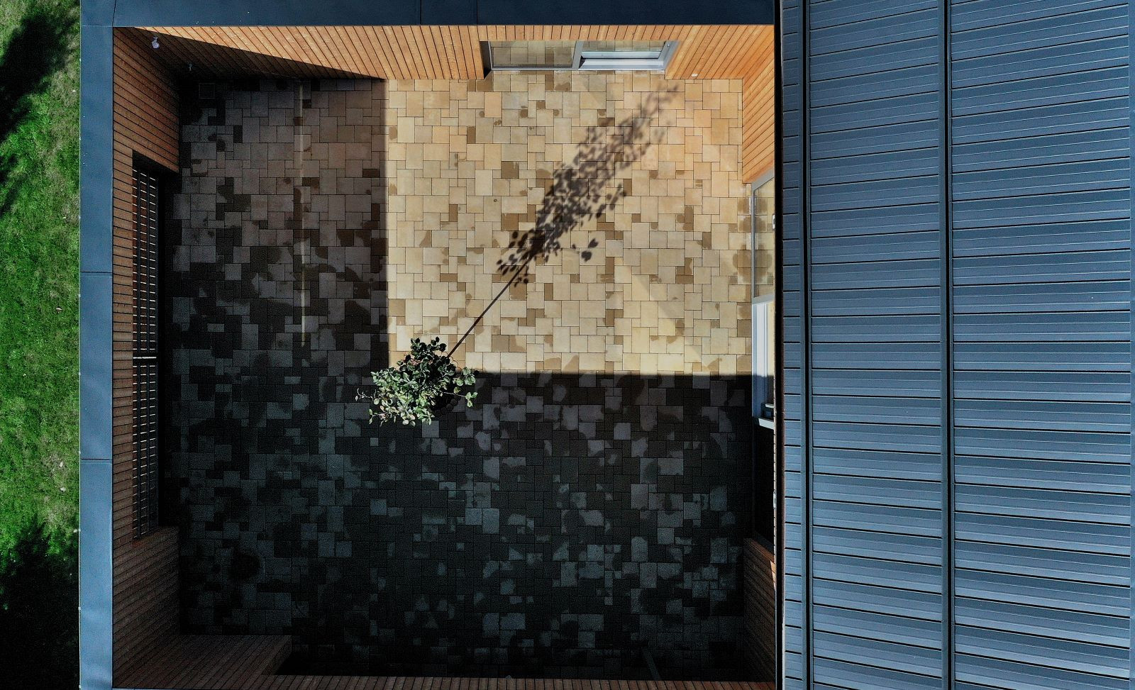 Po počiatočnej skepse sme siahli k osvedčenému priestorovému konceptu átriového domu ako jedinému riešeniu, ktoré poskytne obyvateľom domu benefit južného slnka a zároveň odfiltruje sociálnu expozíciu aktivít oboch susediacich domov.