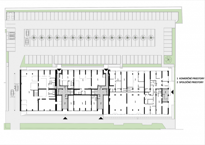 Hlavnou funkčnou náplňou domu je bývanie – trvalé aj prechodné. Rigidný panelový systém 3. až 7. podlažia, pôvodne určený na kancelárie, v tomto smere neponúkal veľa možností. Aj napriek striktne daným súradniciam sa nám podarilo vytvoriť pomerne širokú škálu niekedy až prekvapujúcich priestorov. Dom s tromi dilatačnými celkami sme rozdelili na dve vertikálne bytové sekcie, každá so samostatným vstupom a vertikálnym komunikačným jadrom.