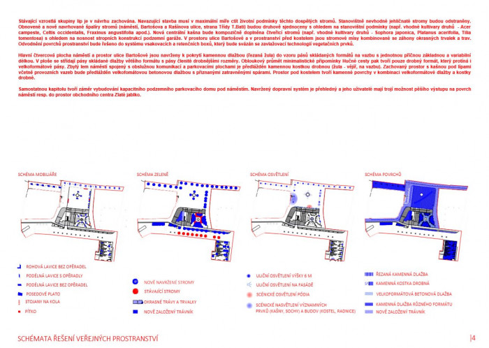 Hlavní čtvercová plocha náměstí a prostor ulice Bartošové jsou navrženy k pokrytí kamennou dlažbou /řezaná žula) do vzoru pásů skládaných formátů na vazbu s jednotnou příčnou základnou a variabilní délkou. V ploše se střídají pásy skládané dlažby většího formátu s pásy členité drobnějšími rozměry. Obloukový průmět minimalistické připomínky Hučné cesty pak tvoří pouze drobný formát, který protíná i velkoformátové pásy. Zbylý lem náměstí spojený s obslužnou komunikací a parkovacími plochami je předlážděn kamennou kostkou drobnou (žula – vějíř, na vazbu). Zachovaný prostor s kašnou pod lípami včetně provozních vazeb bude předlážděn velkoformátovou betonovou dlažbou s přiznanými zatravněnými spárami. Prostor pod kostelem tvoří kamenné povrchy v kombinaci velkoformátové dlažby a kostky drobné.