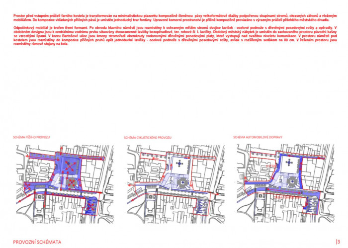 Prostor před vstupním průčelím farního kostela je transformován na minimalistickou piazzetu kompozičně členěnou pásy velkoformátové dlažby podpořenou skupinami stromů, okrasných záhonů a vloženým mobiliářem. Do kompozice vkládaných příčných pásů je umístěn jednoduchý tvar fontány. Upravené komorní prostranství je příčně kompozičně provázáno s výrazným průčelím přilehlého městského divadla.