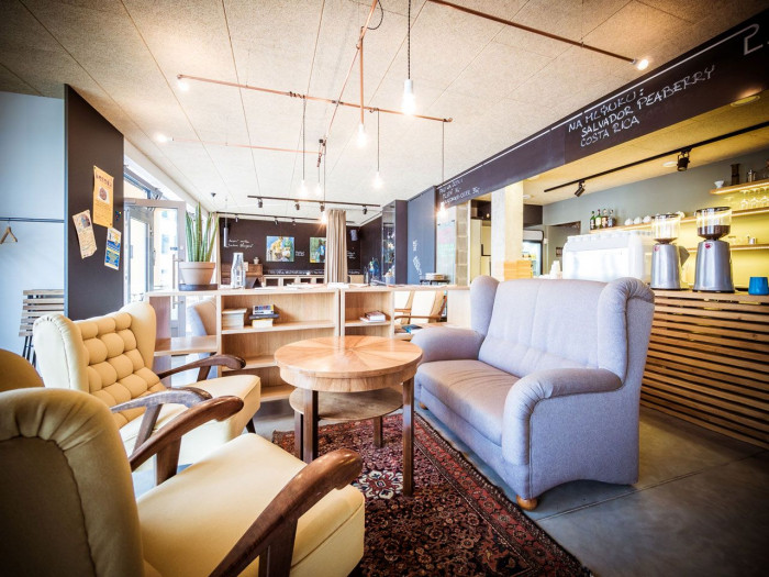 Pro všechny plánované aktivity v kavárně bylo potřeba navrhnout velmi variabilní prostor, a zároveň ho co nejvíce sjednotit a sladit, a to materiálově i barevně. Byl zde kladen velký důraz na použití přírodních materiálů, a ty jsou použity v maximální míře ve svých původních podobách. Na podlaze je velmi odolný a trvanlivý leštěný beton, požadavek na akusticky neprůzvučný strop splňuje speciální heraklitový deskový podhled v přírodním světlém odstínu. Na dvou místech se podařilo uchránit před omítnutím zdi z betonových tvárnic.