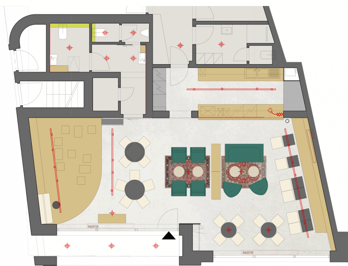 Sociální zařízení kavárny má podlahu také z leštěného betonu. Na nejvíce exponovaných plochách je použitý keramický obklad s výraznou světle zelenou barvou, kolem umyvadel jsou obklady černé matné. Ostatní plochy jsou opatřeny omyvatelným nátěrem ve světle šedém a antracitovém odstínu. Místnosti wc jsou u umyvadel doplněny o malé zavěšené skříňky, na dámském wc je také přebalovací pult. Nad oběma umyvadly jsou na stěně nalepená velká zrcadla a nad nimi pak osvětlení Led páskami v Al profilech.