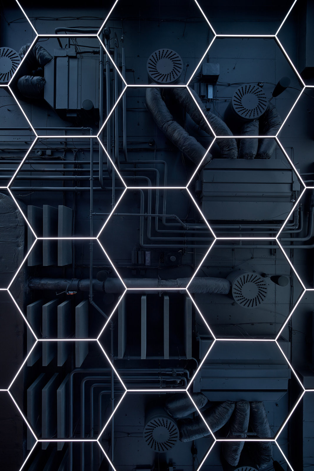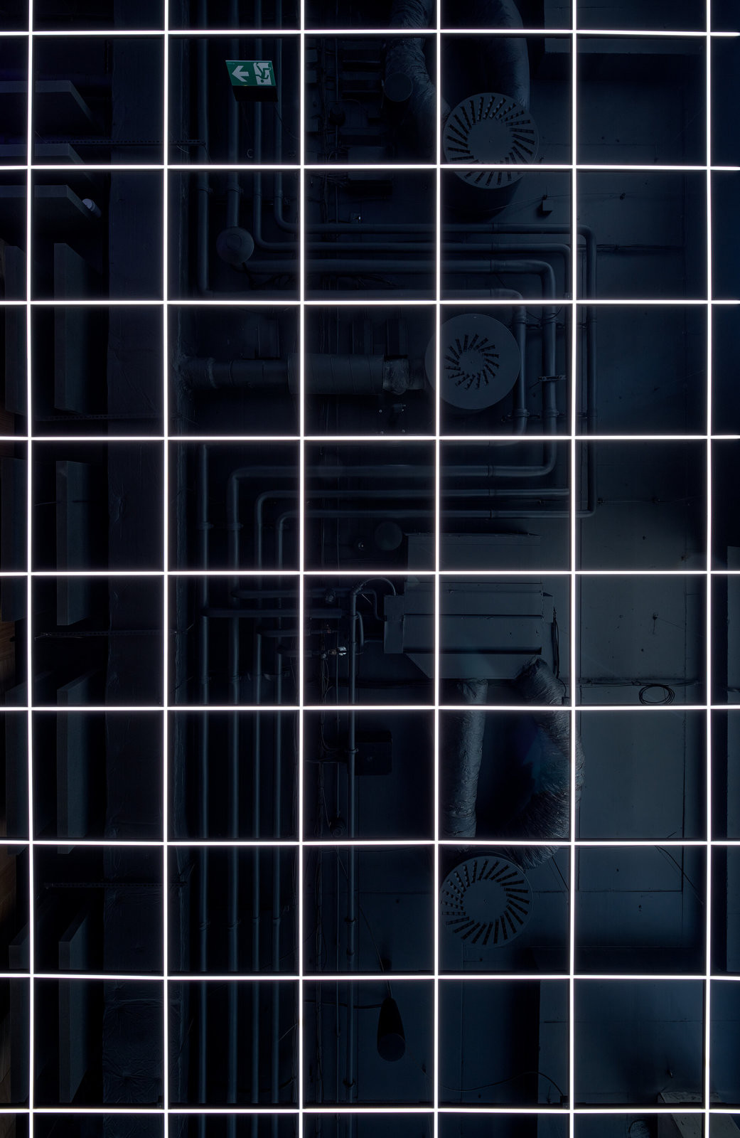 Pravidelná struktura se propisuje i do univerzální světelné mřížky nad celým prostorem, která funguje jako obrazovka řízná až do jednotlivých pixelů (LEDek). Ta se propisuje i na barový pult/display, který funguje také jako přijímací recepce. Světelné rozhraní je dominantou nejen vnitřních prostor. Světélkující podhled se propisuje i ven do prostoru Karlína, v noční krajině ho nelze přehlédnout.