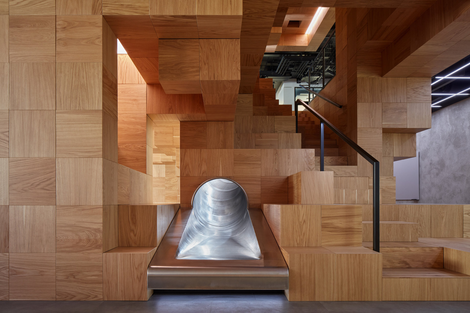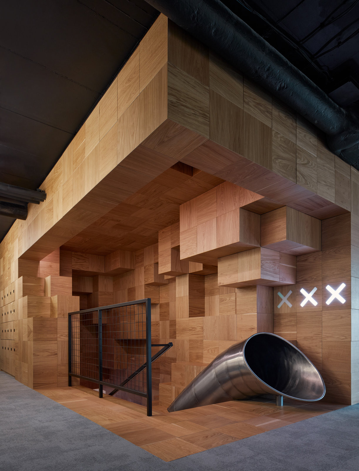 Dřevěná struktura zabírá část půdorysu daleko od oken a skrývá technické zázemí. Navenek nabízí polouzavřené niky a amfiteatry rozšiřující neformální prostory pro práci a prezentace. Součástí struktury jsou schody do vyššího patra a tubus skluzavky.