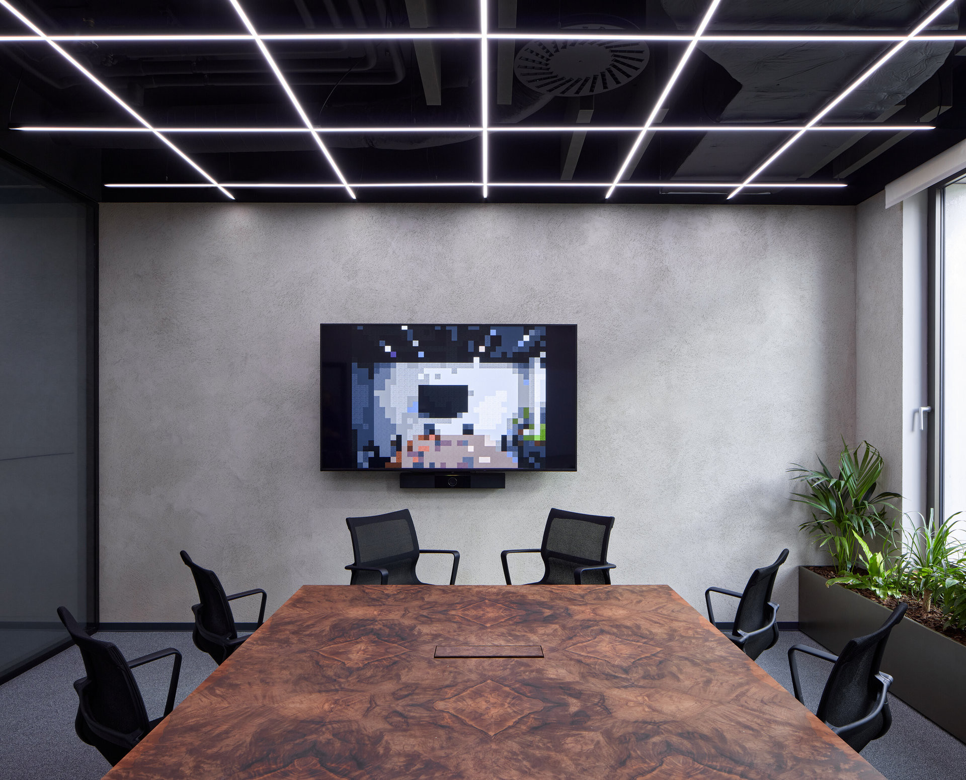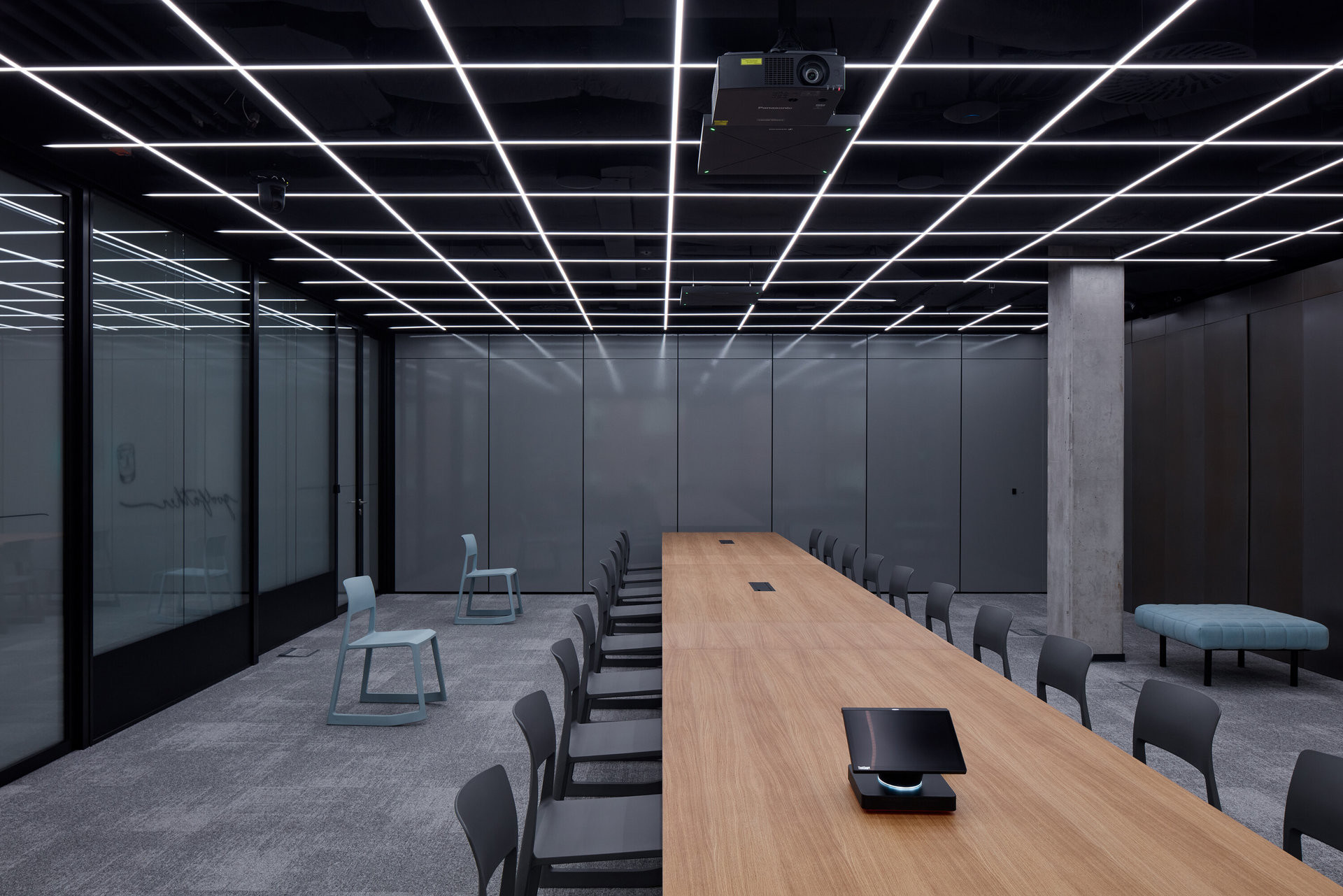 V návrhu jsme hledali téma industriality a snažili jsme se jej dovést do současného vyznění. Těžký černý kovový trubkový nábytek koresponduje s pojetím technologických rozvodů. Proti tomu efemérní proměnlivý rastr světelných čipů a systému čidel ztělesňuje směřování industriality směrem ke světu softwaru a informací.