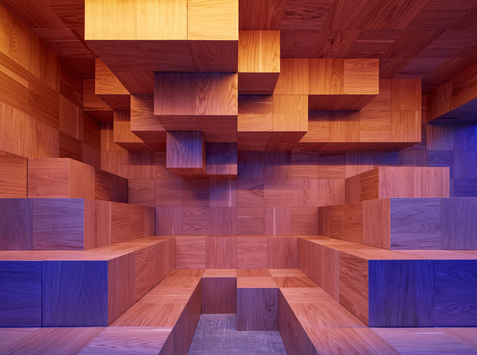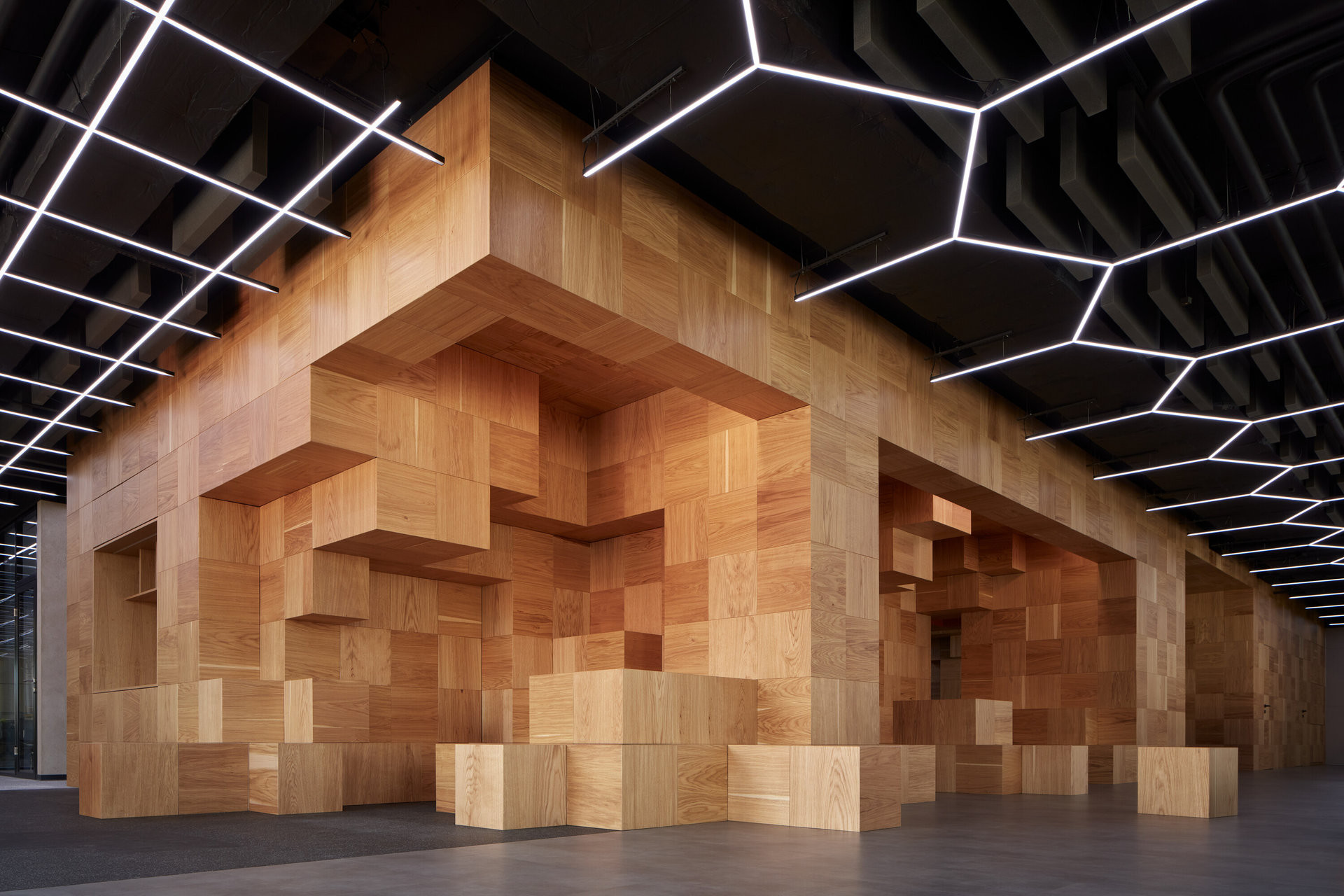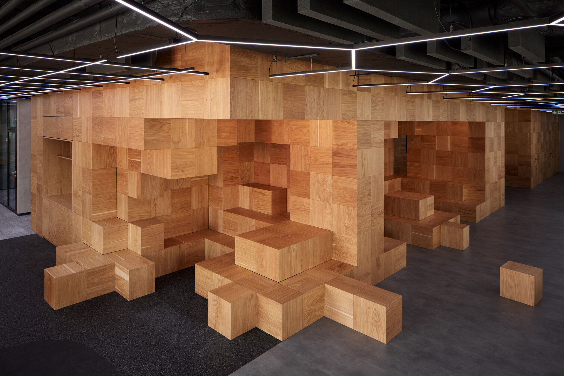 Struktura je esteticky i technologicky inspirovaná tvorbou ve hře Minecraft. Viditelné plochy struktury v rastru 40 x 40 cm jsou dýhované a skladba dýhování je zcela náhodná, bylo zapotřebí vytvořit systém umožňující náhodné umístění jednotlivých kostek v předem navrženém finálním tvaru.
