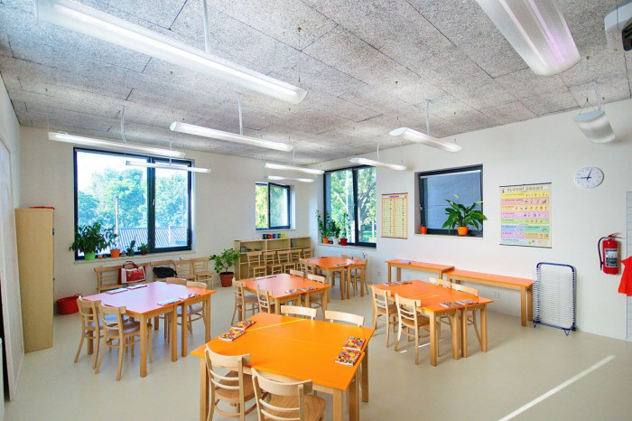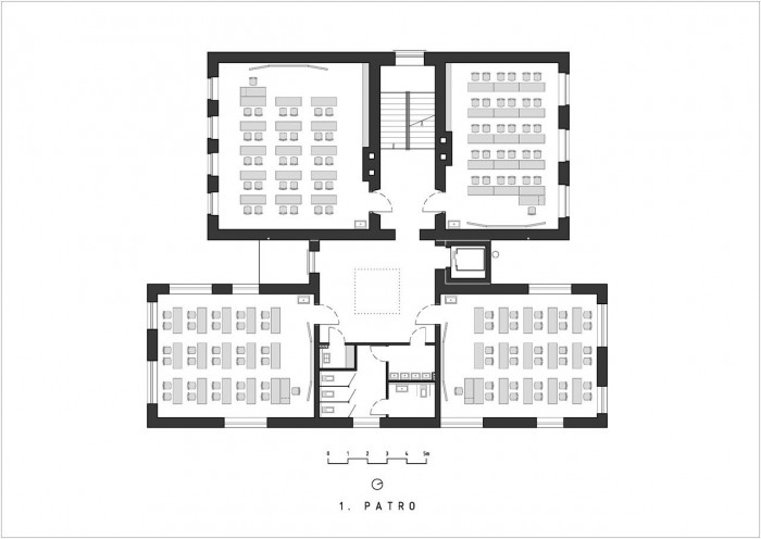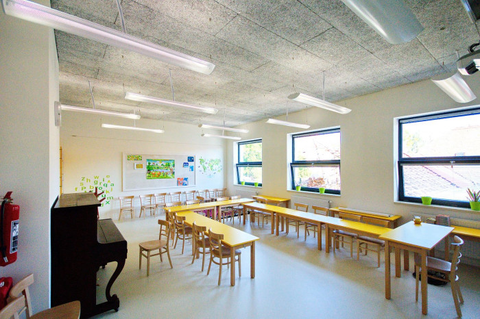 Centrálním komunikačním prostorem je dvoupodlažní atrium. Je osvětleno střešním světlíkem a propojuje obě úrovně učeben. V patře jsou umístěny 4 učebny a sociální zařízení. Učebny nemají všechny stejný tvar ani velikost, i orientace ke světovým stranám se liší. Každá je proto zařízena mírně odlišným způsobem tak, aby školní lavice měly správné osvětlení denním světlem zleva a zezadu.
