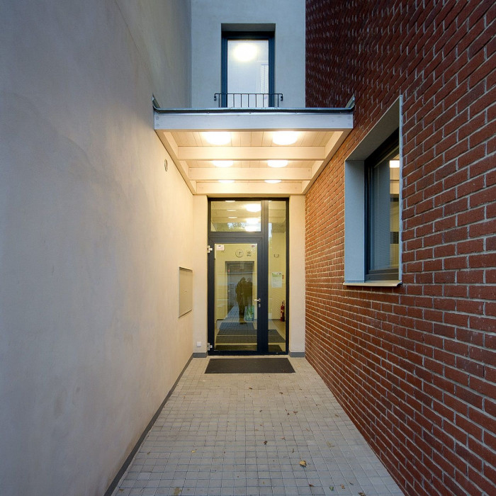 Koncept dostavby je postaven na kontrastu dvou hmot – původní rekonstruované budovy a nové přístavby. Oba objekty se od sebe na první pohled liší jak svým tvarovým řešením (sedlová vs. plochá střecha), tak i materiálem fasády (obyčejná omítka vs. obklad cihelnými pásky) a tvaroslovím okenních otvorů.
