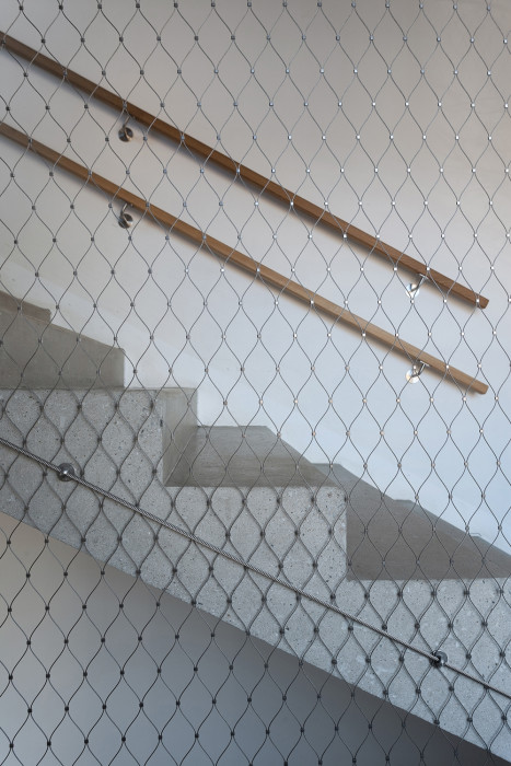 Nezávislý provoz družin zajišťuje přístavba schodiště a zázemí. Nerezová pavučina natažená zrcadlem schodiště přes všechny patra slouží jako zábradlí i galerie výtvarných prací žáků. Provozně jsou nové části napojeny jak na stávající komunikační systém školy, tak na nově navržený bezbariérový vstup v severní části, který umožňuje oddělit provoz školy a družiny. Spojovací krček mezi starou a novou částí školy je potažen polotransparentní mlhou z bílého tahokovu.