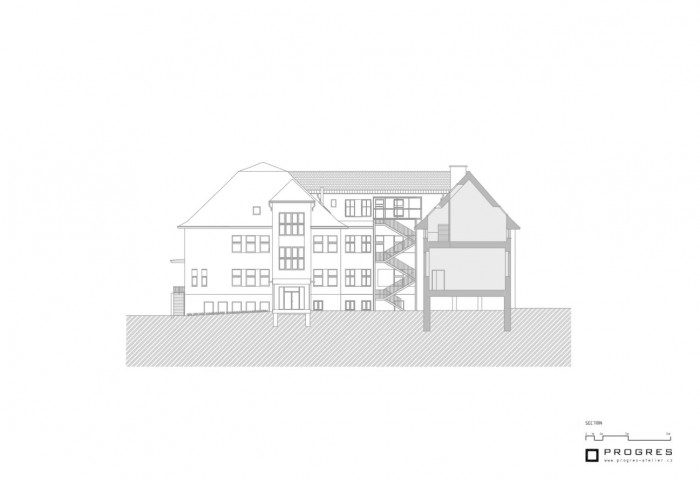 Myslíme si, že je správné se v rámci projektu věnovat problematickým místům vzniklým nešetrnými stavebními zásahy a nově vzniklými provozními nároky. Nenavazujeme proto na nekvalitně řešené části, nedolepujeme další apendix, ale pracujeme s návrhem v dialogu s původní historickou budovou. Zvenku samozřejmé doplnění nechává uvnitř vzniknout moderním, zajímavým a prosvětleným prostorům.