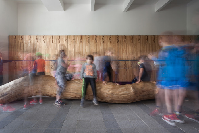 Novou nástavbu navrhujeme nad půdorysem tělocvičny a jejím zázemím. Velkorozponové ocelové nosné rámy, dávají vzniknout převýšeným podkrovním prostorům pro výuku výtvarné výchovy, chemie fyziky a aktivity školní družiny. Specializované učebny jsou velkoryse otevřené do hřebene krovu ve výšce sedmi a půl metru. O příjemné studijní prostředí se stará oboustranné nasvětlení denním světlem a akustický obklad z dřevovláknitých desek. Do méně kvalitních prostor v historické budově umisťujeme hlavní šatny pro 300 žáků. Jejich dominantou je tunu vážící dubový kmen, který musel své místo v šatnách najít bez pomoci mechanizace.