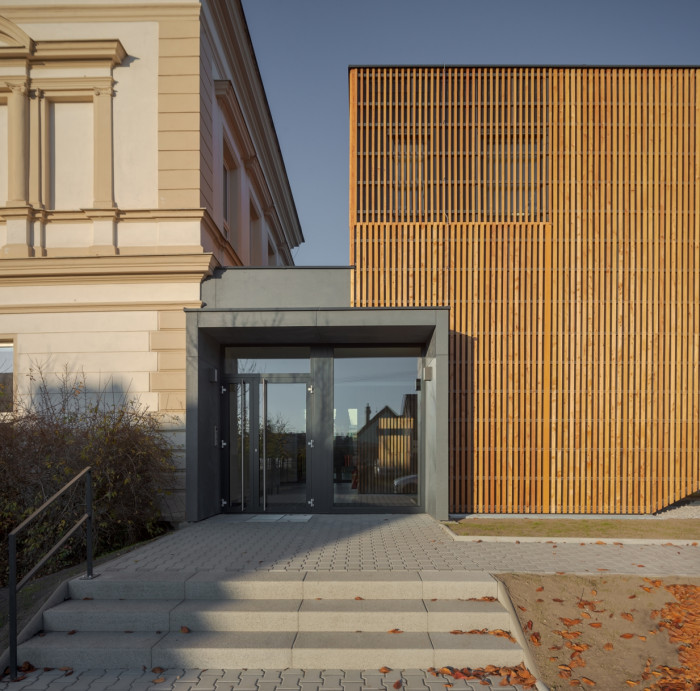 Vstupní část je zvýrazněna rukávcem, který chrání uživatele před nepřízní počasí a probíhá do zahrady, kde je ukončen stejným architektonickým prvkem. Hmota nástupu je zaklesnuta do hlavní hmoty objektu. Tu tvoří dřevěný hranol s propsaným schodištěm do fasády z uliční části. Pod vykonzolovaným schodištěm tak vzniká krytý servisní vchod, který je funkčně upozaděn oproti hlavnímu vchodu. Ze zahradní zóny se do objektu propisují dvě pásová okna vzájemně posunutá oproti sobě v horizontálním směru sloužící k vizuálnímu kontaktu se zahradou. Zbytek okenních otvorů je na fasádě potlačen dřevěným předsazeným roštem. Ten je v nárožních částech z ulice rozředěn větším rozpalem a jiným druhem řeziva, aby došlo k rytmizaci fasády a různým propustnostem světla ve večerních hodinách z interiéru do exteriéru. Rošt dále plní funkci estetickou, kde za použití přírodních materiálů dochází k většímu kontaktu a souznění s okolní zelení a dalšími přírodními prvky okolí. Vymezuje a akcentuje relaxační funkci nového objektu oproti strohé klasické budově k účelům výuky.