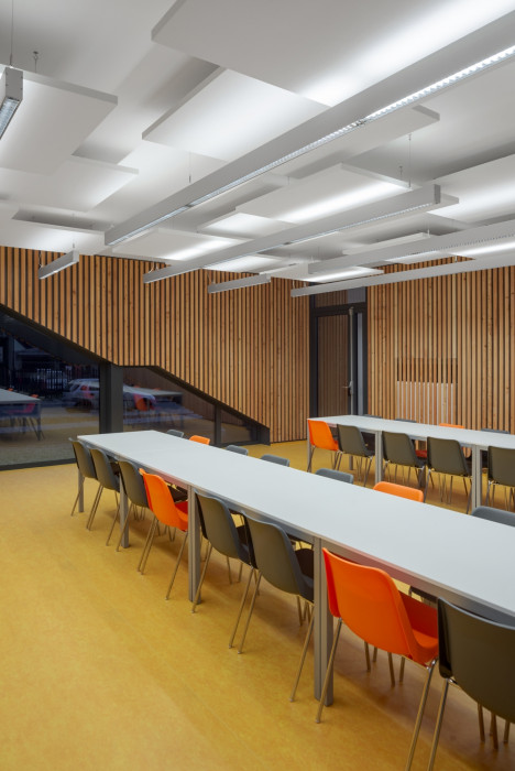 Stropy hlavních místností jsou opatřeny protihlukovým systémem, který je rytmizován ve dvou úrovních a nepravidelným půdorysným umístěním (cik-cak).