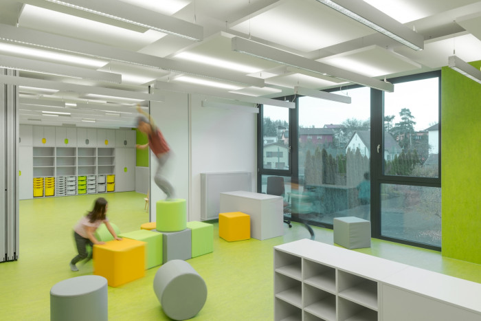 Družina je dimenzována tak, aby hmotově nekonkurovala stávajícímu dvoupodlažní objektu školy se sedlovou střechou. Ta je navržena jako dvoupodlažní se střechou plochou. Hlavní hmoty objektů jsou od sebe odsunuty, aby byla zvýrazněna návaznost v časové ose. Ke kontaktu dochází pouze v přízemí, ve vstupní část. Záměrem je jít v kontrastu k historizujícímu stylu školy, která byla vystavěna na počátku 19. stol. Nově vzniklý objekt je pojat v minimalistickém stylu, jako dřevěný hranol.