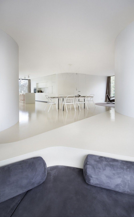 Posuvná skleněná stěna umožňuje propojit obytný prostor s venkovní terasou na louce. Interier je proveden v monochromatické barevnosti ve valérech bílé – neutrální rámec pro barevnost lesa v různých denních a ročních obdobích. Realizace byla provedena svépomocí.