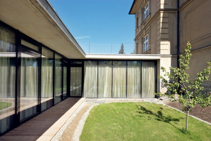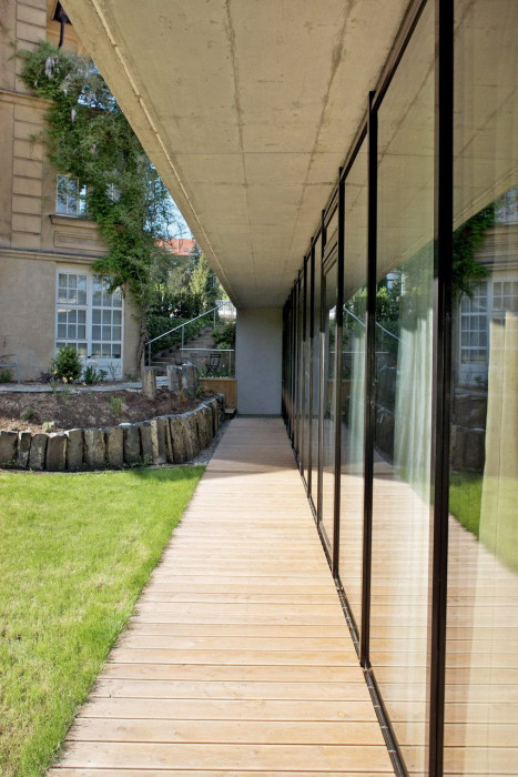 Jeden z nich přímo navazuje na historizující vilu z počátku minulého století, druhý objekt stojí samostatně na protilehlé straně zahrady. Oba objekty leží na hranici pozemku a prosklenými fasádami se obrací do zahrady, jíž společně s vilou vymezují. Nové objekty mají zelenou střechu v úrovni okolních chodníků a ze strany ulice nejsou téměř vidět. Na střeše přístavby je umístěno také parkoviště pro klienty přístupné z Patočkovy ulice.
