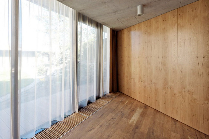 V interiérech byly navrženy především přírodní materiály. Na podlahách jsou lamely z masivního dubového dřeva a dlažba ze štípané břidlice. Stěny jsou částečně z pohledového betonu anebo bílé omítané, stropy jsou také z pohledového betonu. Dubové dýhované desky jsou použity i na obklad některých stěn.