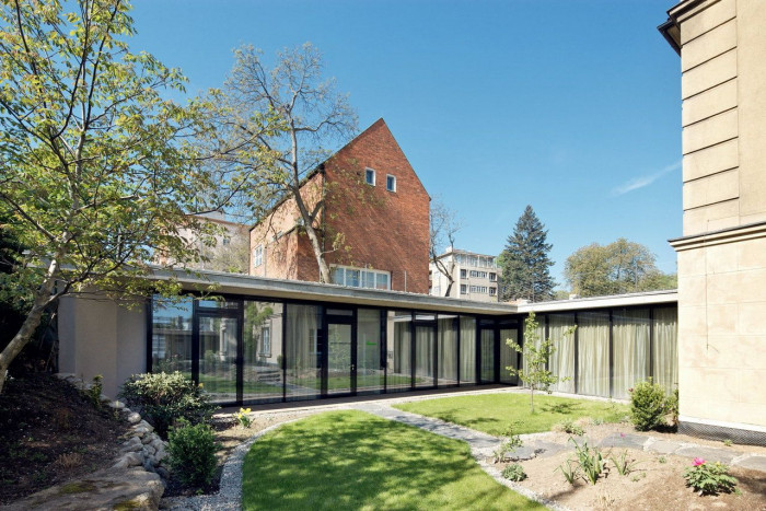 Jižně orientovaná zahrada slouží všem návštěvníkům kliniky a vzájemně propojuje nově vzniklé budovy a původní samostatnou vilu. Díky této koncepci uspořádaní budov došlo k snížení hluku z okolních ulic, zejména v zahradě a vznikly tak příjemné relaxační prostory uprostřed rušné zástavby.