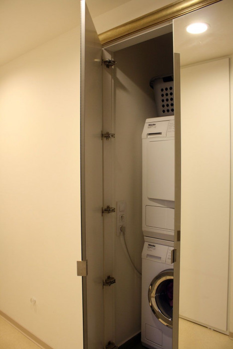 Komunikace, která celý byt spojuje, je s ním sjednocena podlahou a spojuje původní byty, má skrytý prostor pro pračku a sušičku. Tato místnůstka je umístěna za velkoformátovým zrcadlem v neohistorizujícím rámu. Podél komunikace je i vestavěná skříň.