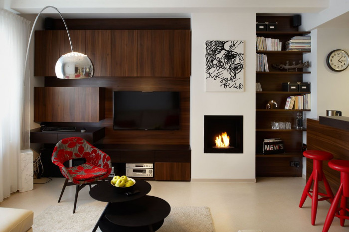 V obytné části jsou otevřené i uzavřené úložné prostory s pracovním koutem a prostorem pro TV. Plasticky jsou úložné prostory rozděleny falešným pilířem s krbovou vložkou na bioplyn. Jednolitá podlaha je v prostoru sedačky a konferenčního stolku narušena kusovým kobercem. Sedačka je vyrobena na míru a svoji šířkou vyplňuje celý prostor stěny navazující na jídelní kout.