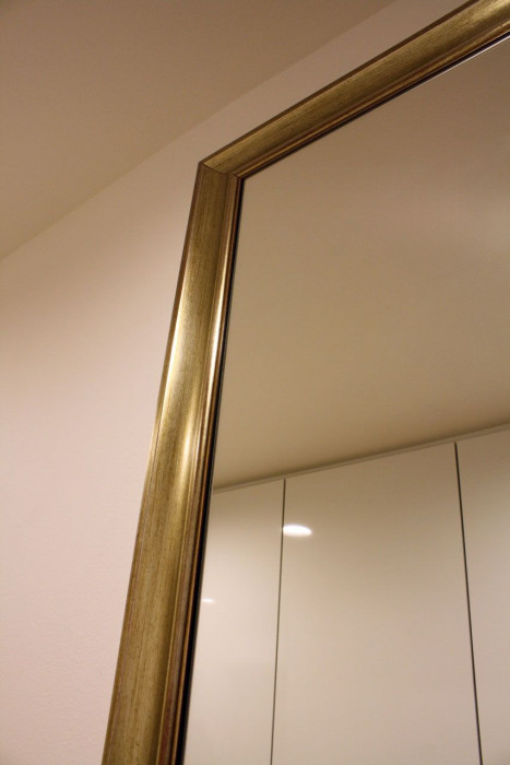 Navazující šatna obsahuje vestavěnou skříň v celé její délce skrytou pojízdným panelem se zrcadlem v masivním rámu. Za posuvnými dveřmi je koupelna se sprchovým koutem a umyvadlem s úložnými prostory za zrcadlem.