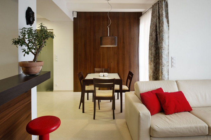 Byly ponechány vstupní dveře do nového bytu a přímé navazující prostory, ze zádveří vstup do toalety a ponechána byla i koupelna. Podlouhlá dispozice původního bytu je využita pro ložnice a dětské pokoje. Podél těchto místností vznikla chodba, která končí šatnou navazující na ložnici rodičů, ze které je přístup do samostatného sprchového koutu. Chodba na svém konci prochází místem spojení obou původních bytů a ústí do obytného prostoru s kuchyní.