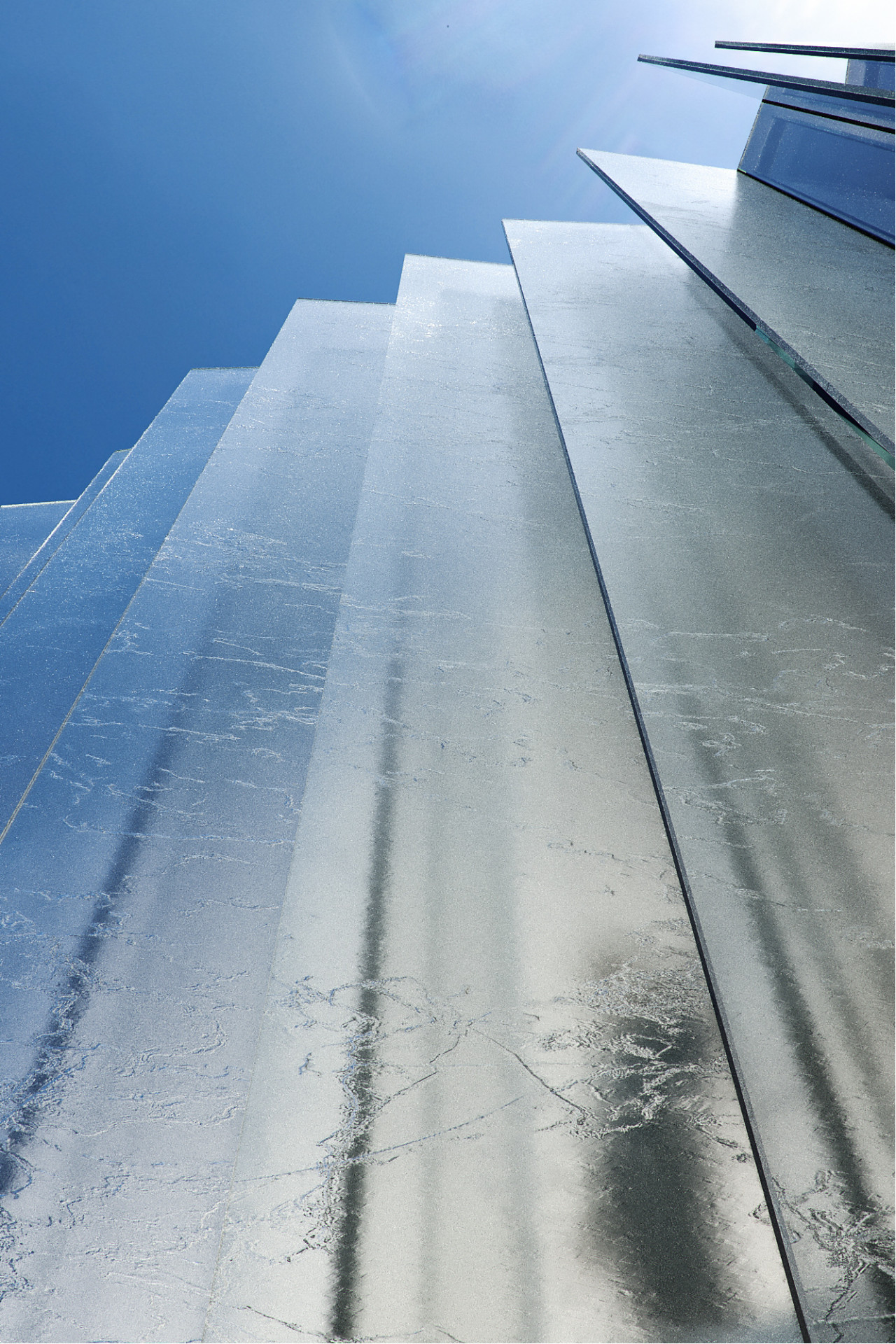 Odstoupením, stejně jako dále odražením od stávajícího objektu, je navrhované řešení dvorů jasně koncipováno jako nová vrstva. Transparentní, výtvarně pojatá skleněná fasáda nových objemů nechá vyniknout a působit původní koncept křížového půdorysu domu. Konstrukce a formát jednotlivých skel odráží technologické a materiálové možnosti současnosti.
