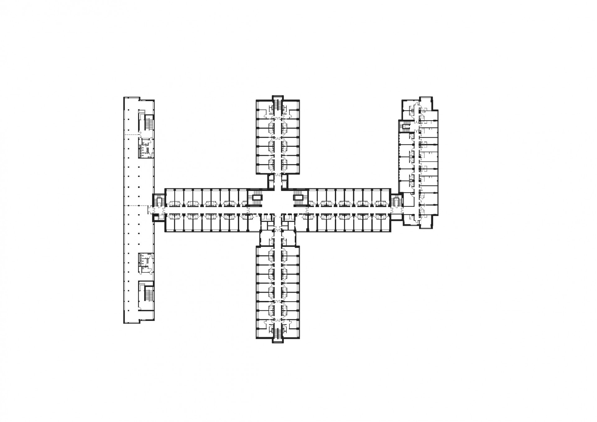 Z hlediska dnešních nároků na konektivitu a naprosto zásadní potřebu kultivace a aktivace veřejného prostoru zůstává objekt neprostupným blokem. Solitérní budova křížového půdorysu se tak vůči okolnímu prostoru otevírá pouze svou formální dispozicí.