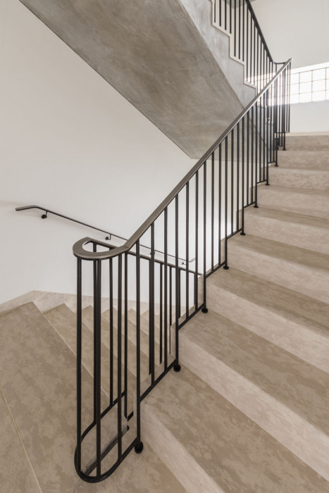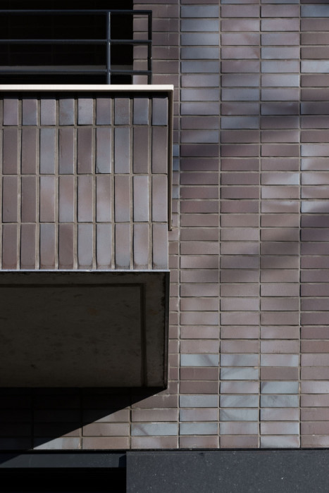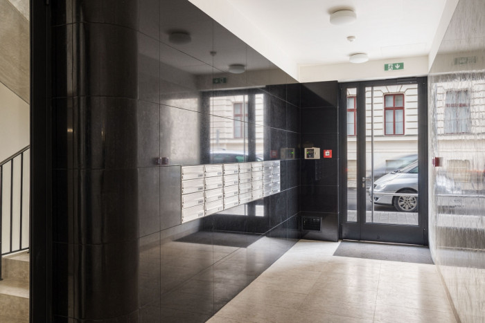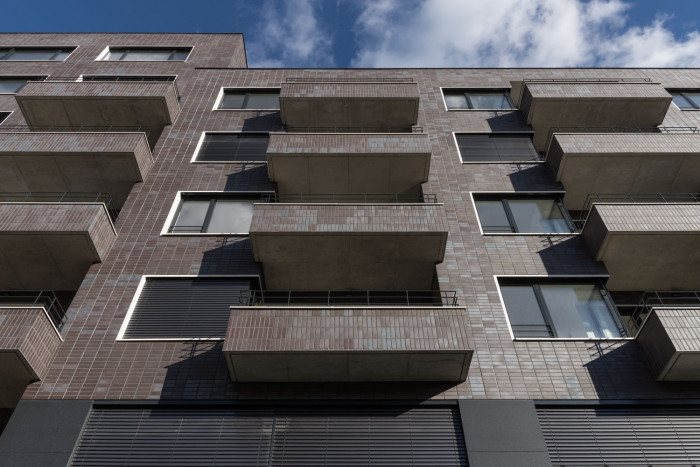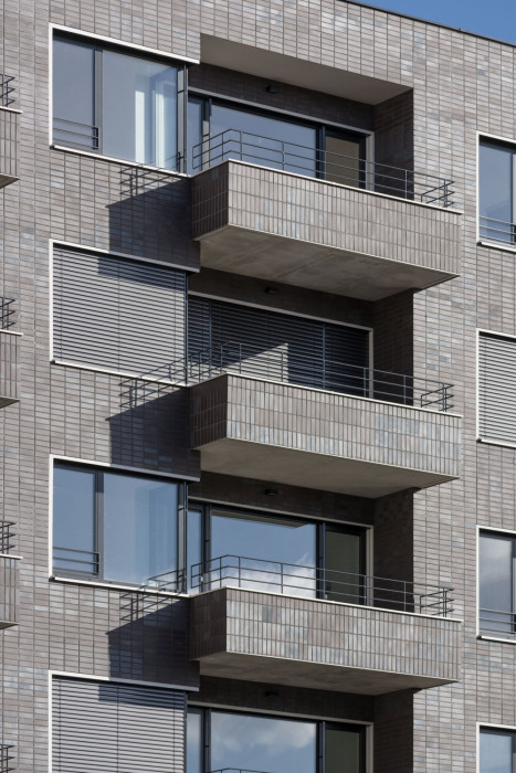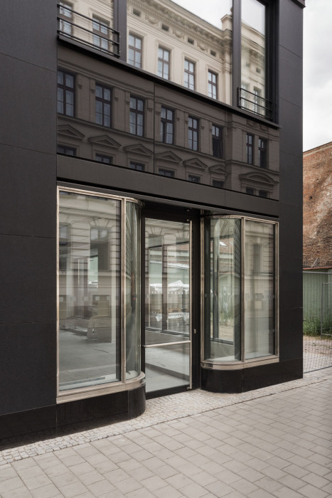 Na fasádě jsou v pravidelném rastru uspořádána velká okna do obytných prostor, jejichž špalety jsou opatřeny omítkou v bílé barvě. Na jihozápadní stranu a na jihovýchodní stranu jsou umístěny polozapuštěné lodžie a balkóny. Fasáda je obložena režnými cihlovými pásky, které svoji strukturou a proměnlivou barevností dodávají stavbě přirozené, drobnější měřítko. Dvoupodlažní parter je obložen černou žulou, výkladce jsou opatřeny obloukovými skly na nárožích a leštěnými nerezovými zasklívacími profily. Hmota osmého patra je výškovým akcentem nově vzniklého nároží budoucí nové městské třídy.