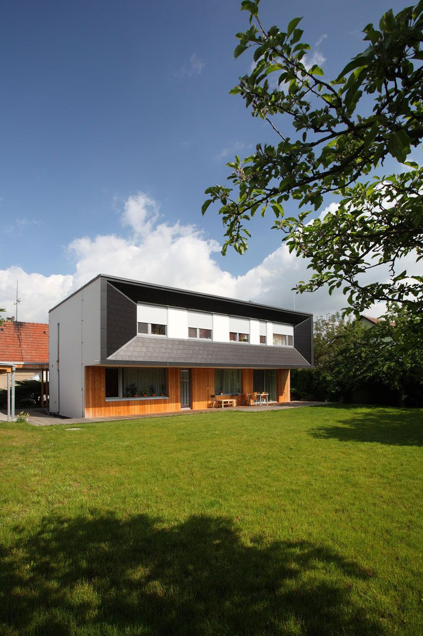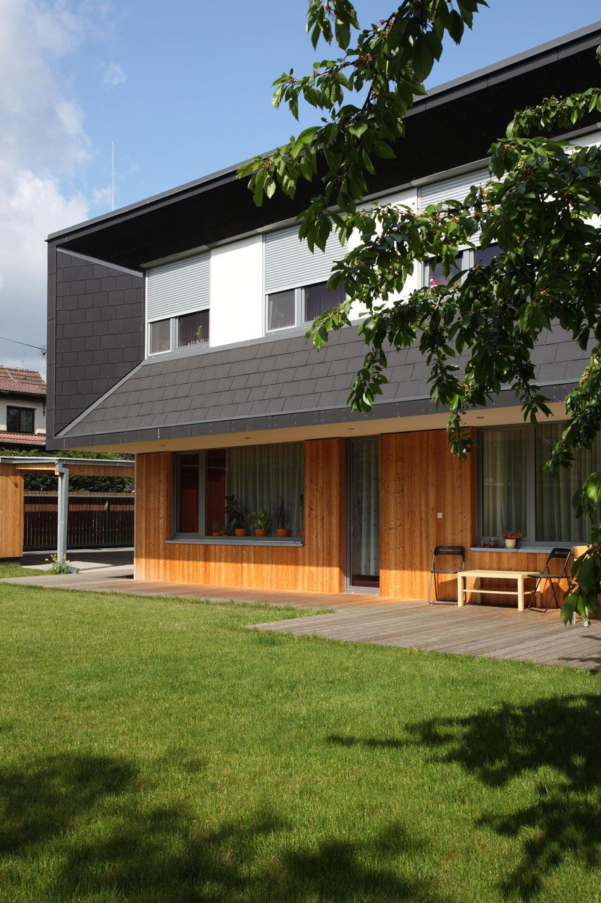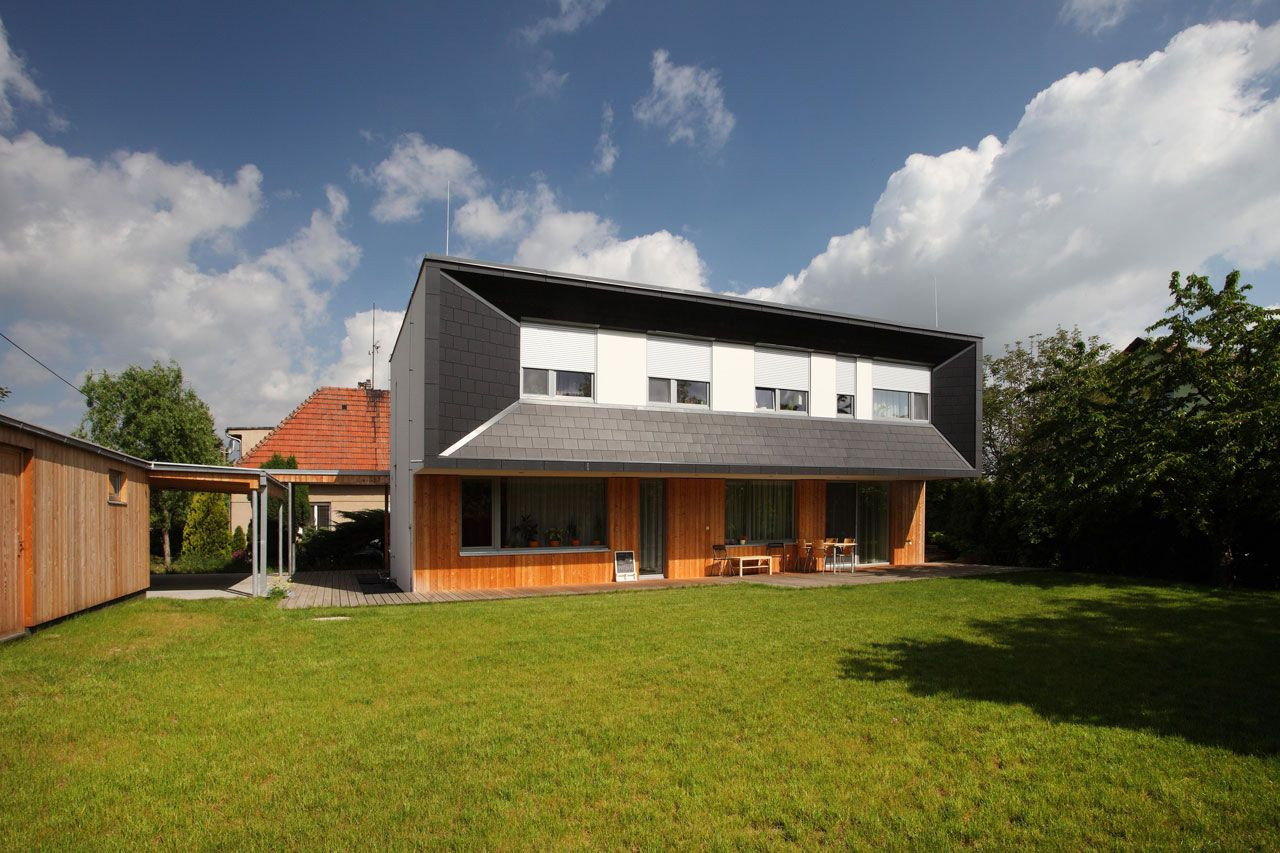 Nápaditě řešený přesah střechy představuje výrazný prvek vytvářející architektonický výraz celého domu, který je však utajen všem kolemjdoucím, neboť uliční fasáda je řešena v hladké omítce v kombinaci s dřevem na úrovni přízemí. Hravý detail tvoří vstupní dveře provedené v odstínu tlumené červené. Vnější tvář domu směrem do ulice tak působí celkem nenápadným dojmem nijak nevybočujícím z architektury okolních staveb. Čelní plocha vykonzolovaného patra včetně bočních skosení je obložena střešní vláknocementovou krytinou Cembrit, jejíž grafitově šedá barva i struktura kontrastuje s dřevěným obkladem přízemí v medovém odstínu.