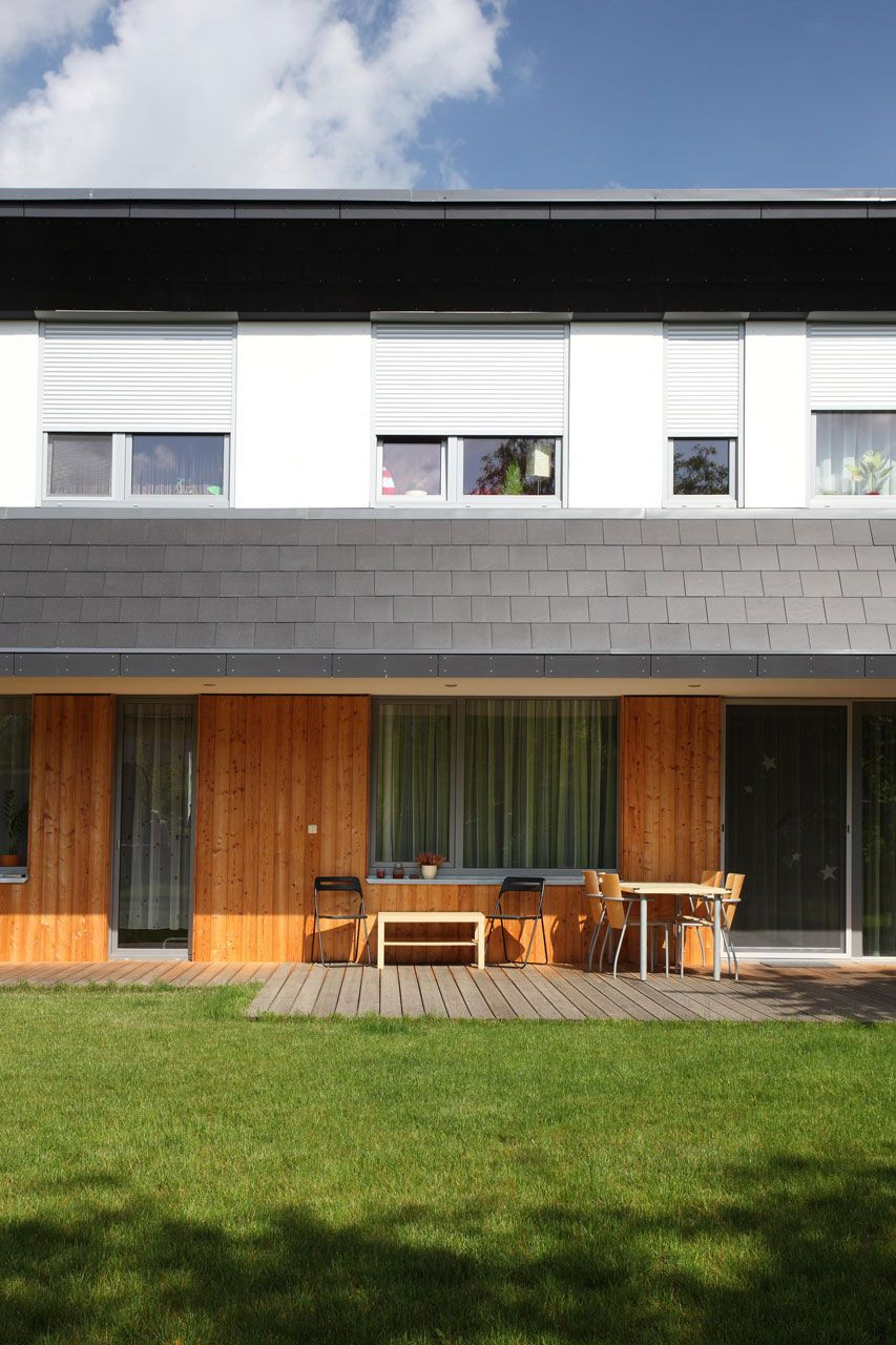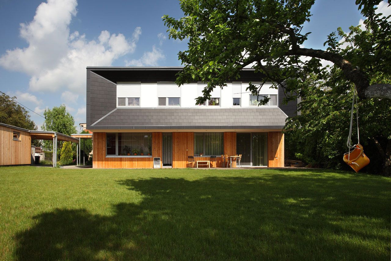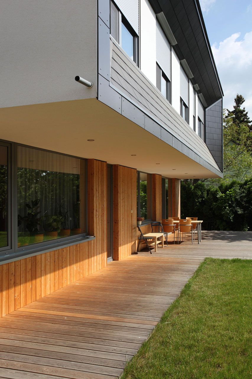 Nápaditě řešený přesah střechy představuje výrazný prvek vytvářející architektonický výraz celého domu, který je však utajen všem kolemjdoucím, neboť uliční fasáda je řešena v hladké omítce v kombinaci s dřevem na úrovni přízemí. Hravý detail tvoří vstupní dveře provedené v odstínu tlumené červené. Vnější tvář domu směrem do ulice tak působí celkem nenápadným dojmem nijak nevybočujícím z architektury okolních staveb. Čelní plocha vykonzolovaného patra včetně bočních skosení je obložena střešní vláknocementovou krytinou Cembrit, jejíž grafitově šedá barva i struktura kontrastuje s dřevěným obkladem přízemí v medovém odstínu.