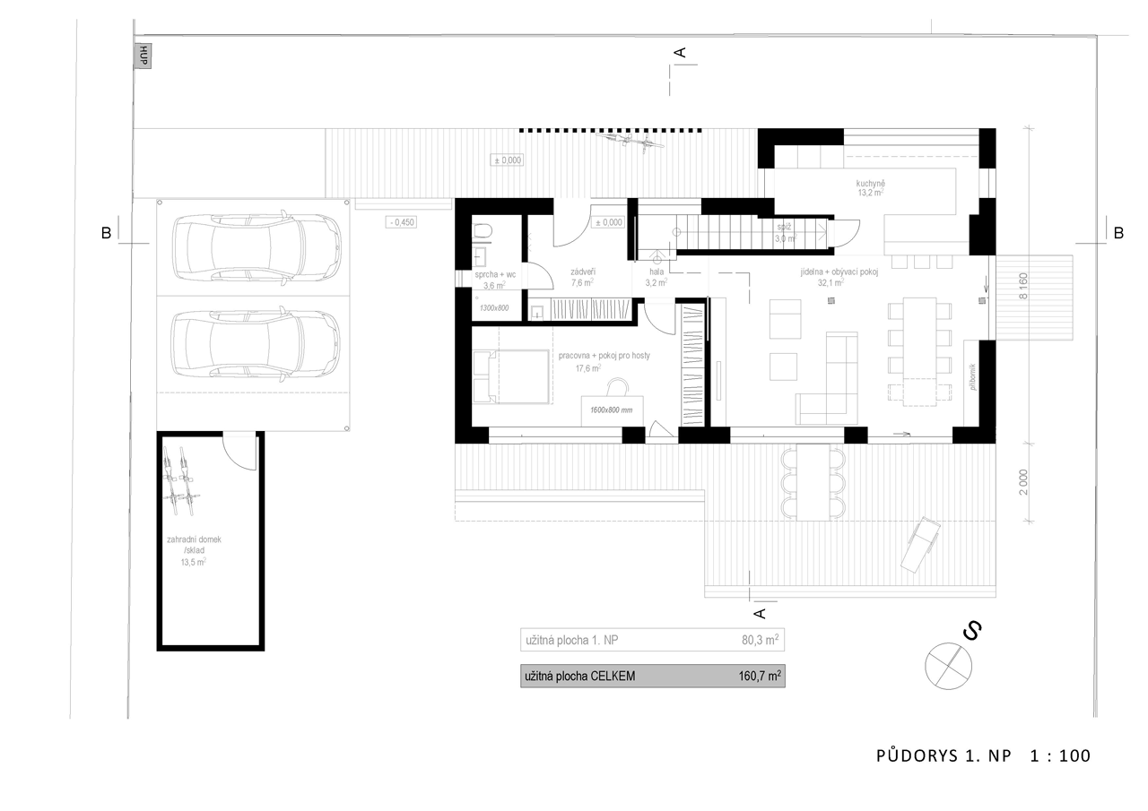 Zádveří plynule přechází do obytného prostoru přes halu, kterou je z obou stran možné oddělit posuvnými dveřmi a přidělit jí, stejně jako navazujícímu schodišti do patra, buď funkci obytnou, nebo spojovací. Přízemí vévodí velký obytný prostor s jídelnou, na nějž navazuje kuchyň se spíží a nalezneme zde i pokoj pro hosta, který je využívaný i jako pracovna.
