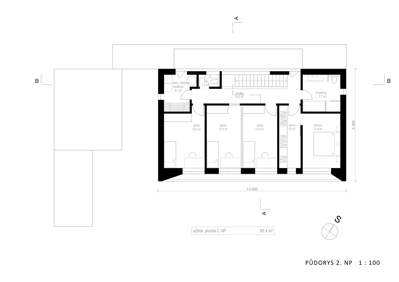 Pokoje v patře jsou racionálně uspořádány podél jihovýchodní fasády domu a nabízí tak výhled do zahrady, čímž zajišťují svým obyvatelům nejen intimitu ale i výhled plný zeleně. Dispozice ložnicového patra je natolik prostorná, že se zde pohodlně vejdou tři dětské pokoje.