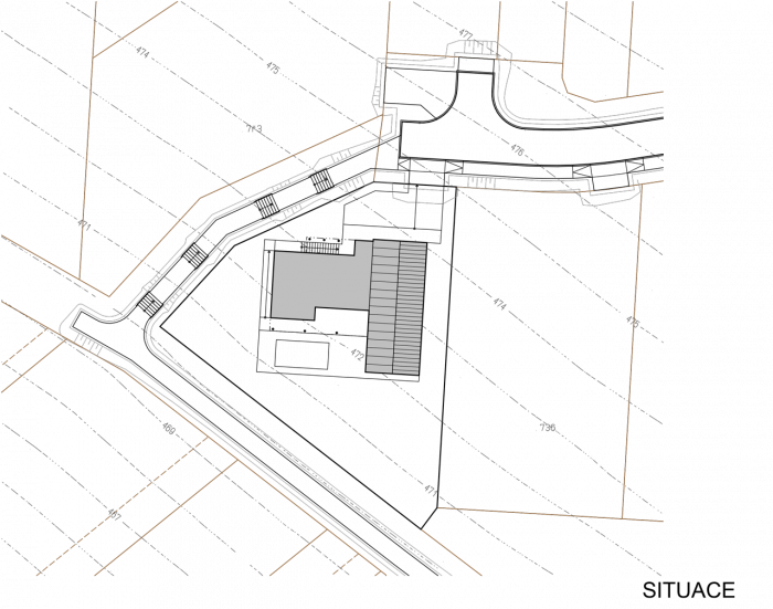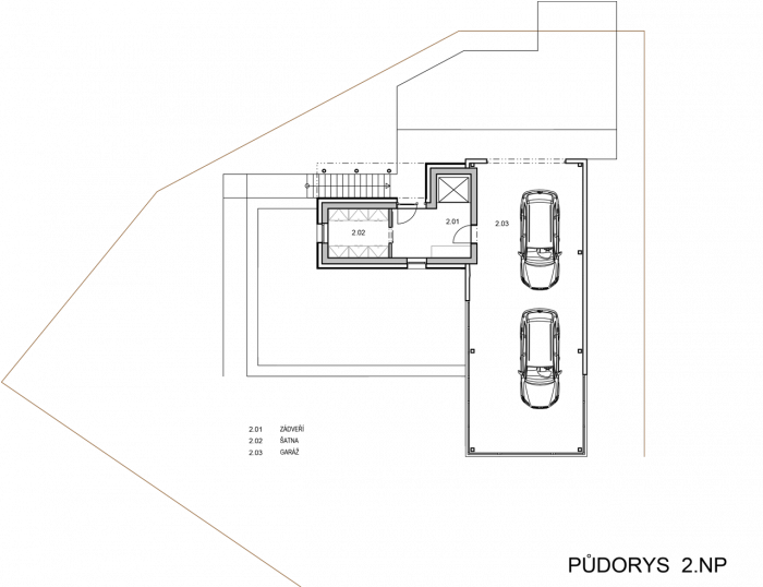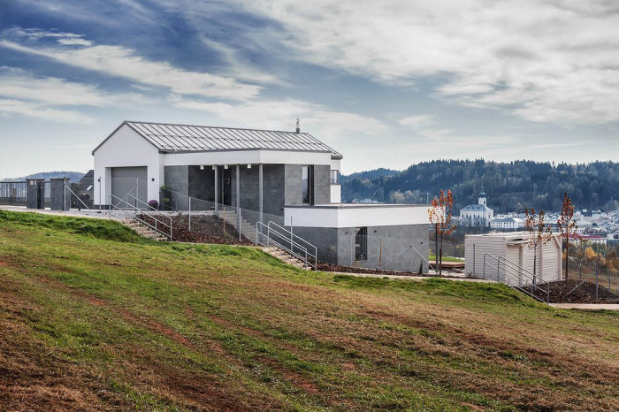 Řešením je dům se vstupem do druhého nadzemního podlaží. Kromě zádveří je ve vstupním podlaží šatna a garáž, která slouží i jako sklad sportovního vybavení, zahradního nábytku a nářadí. Pásové okno garáže, které navazuje na třístranné prosklení obývacího pokoje, má v budoucnu umožnit případné jiné využití tohoto prostoru.
