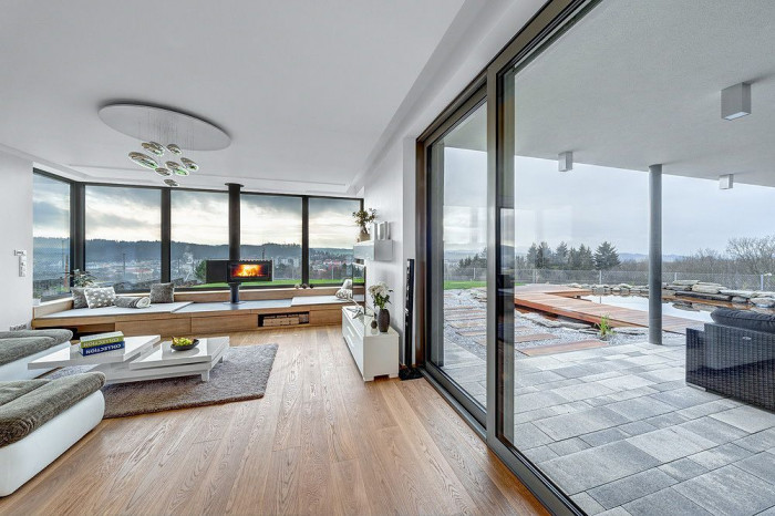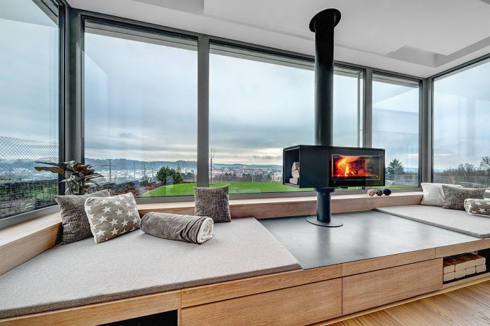 Obytné podlaží pracuje s výhledem na město, který pozemek nabízí. Obytný prostor je ukončen prosklenou stěnou, takže je slunce sem má přístup od brzkého rána až do večera. Prosklená stěna je doplněna lavicí s úložnými prostory a krbem. Obě ložnice a koupelna mají přístup na zastřešenou terasu a od obytného prostoru jsou odděleny šatnou. V blízkosti obytného prostoru je umístěna toaleta a technická místnost.