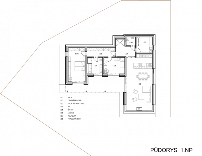 Do obytného podlaží se sjíždí výtahem. O schodech jsme dlouze diskutovali, a došli jsme k tomu, že nechceme v domě prostor, který jeden z uživatelů domu nikdy nepoužije, nikdy tam nemůže vstoupit a nemůže ho ani uklidit. Výtah má pochopitelně záložní zdroj.