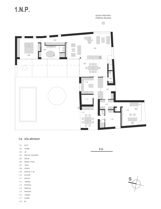 Hlavní vstup do objektu je umístěn v jižní fasádě v návaznosti na vstup a vjezd na pozemek. Přes vstupní halu lze pokračovat do hlavního obytného prostoru, do kuchyně, pohotovostního WC a do jižního křídla, v němž se nachází pracovna, šatna a prádelna. Tu je případně možno jednoduchým způsobem adaptovat na pokoj pro hosty či použít jako tradiční „vejminek“. Z kuchyně je přes chodbu přístupná technická místnost a venkovní kryté sezení, které je v zimním období možno uzavřít integrovaným roletovým systémem.