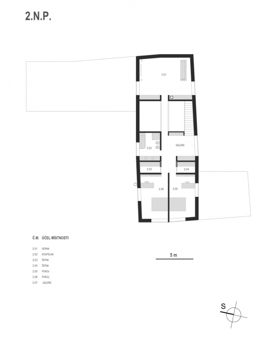 Kosmetický odklon od důsledně pravoúhlého schématu zjemňuje poměrně značný objem domu, má význam z hlediska proslunění a v neposlední řadě působí v kontextu gotické parcelace jádra obce přirozeně. Má své opodstatnění i v interiérech – zužováním či rozšiřováním prostoru lze například naznačit hostům, které části domu jsou již soukromé, aniž by bylo třeba je pohledově oddělovat – vazba soukromých částí na velkoryse modelovaný hlavní obytný prostor je nenucená, přitom však snadno rozpoznatelná.