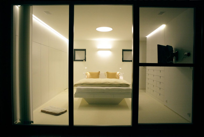 Hlavní obytný prostor je tvořen jídelní a obývací částí, které jsou od sebe symbolicky odděleny pouze minimalisticky pojatým krbovým tělesem. Na obývací část navazuje severní křídlo, v němž se nachází ložnice rodičů s vlastním zázemím.