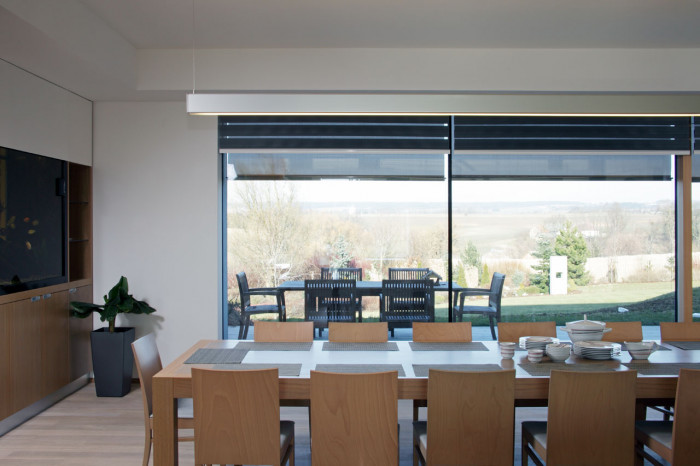 Hlavní obytný prostor spojuje kuchyň, jídelnu i obývací pokoj, jenž od jídelny opticky odděluje nerezové schodiště se skleněnými stupni, po kterém se dostaneme do haly v prvním patře. Velkoryse pojatý obytný prostor navíc rozšiřují terasy ze severní i jižní strany. Severní terasa navazuje na jídelnu a byla navržena především jako tzv. „snídaňová“, neboť se do jejích míst příjemně opírá ranní slunce.