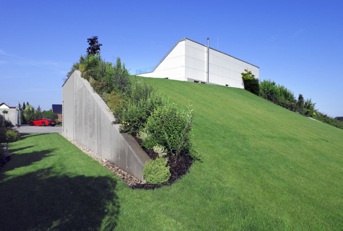 Poloha pozemku zajišťuje obyvatelům domu ničím nerušené daleké výhledy. Autoři projektu ovšem museli při umístění domu respektovat ochranné pásmo vysokotlakého plynovodu, které protíná parcelu na severní straně.