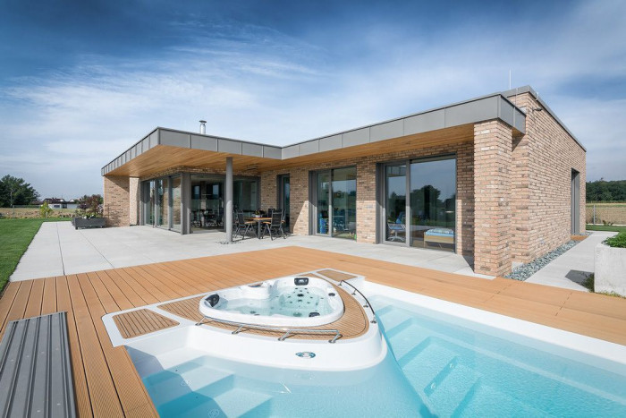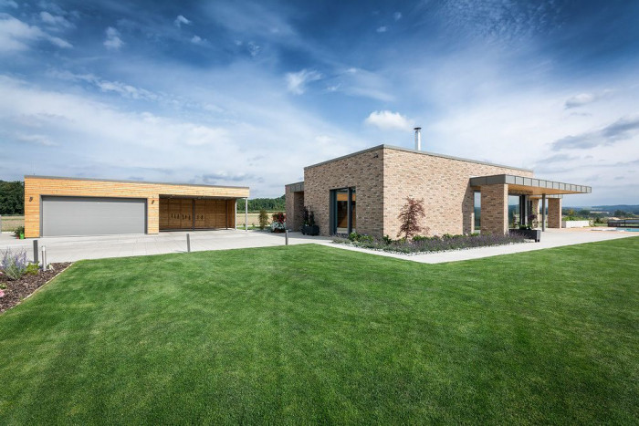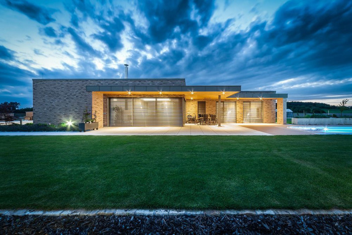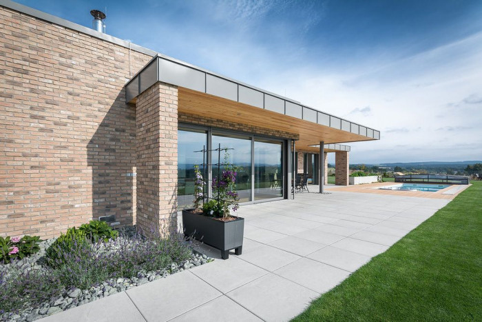 Fasády jsou sjednoceny obkladem z lícových pásků v elegantních odstínech pískové a šedé. Linie markýzy a ostění otvorů jsou zvýrazněny oplechováním v šedém odstínu.