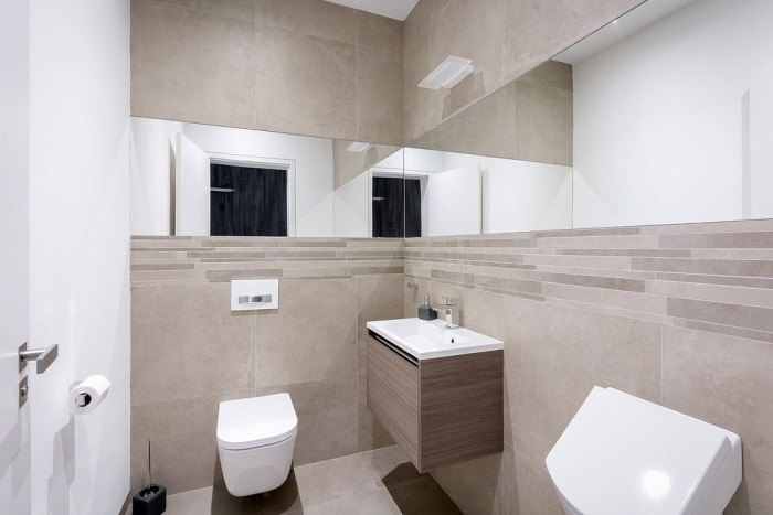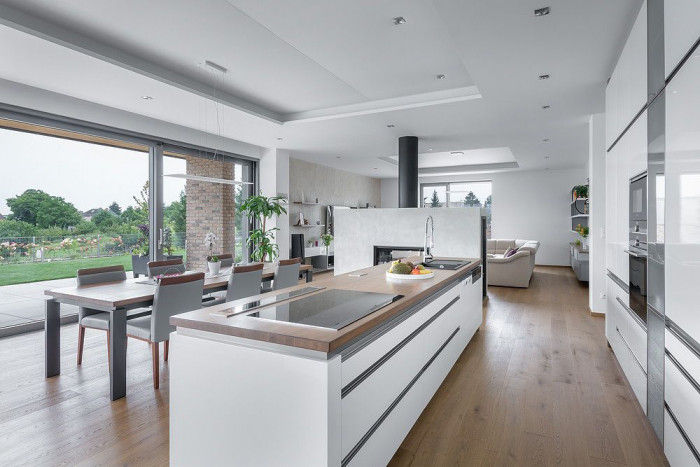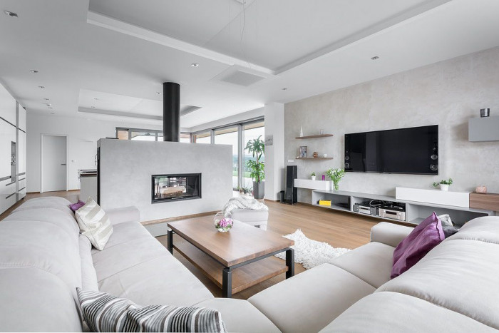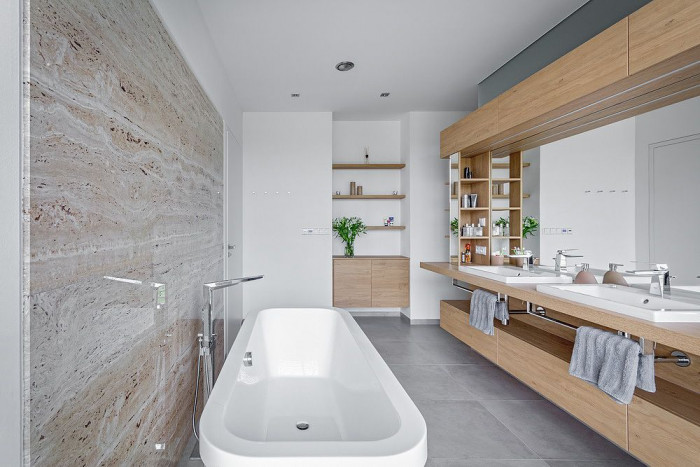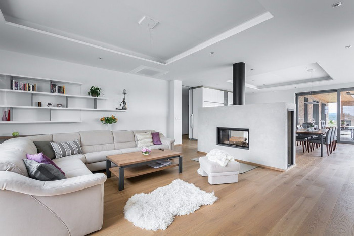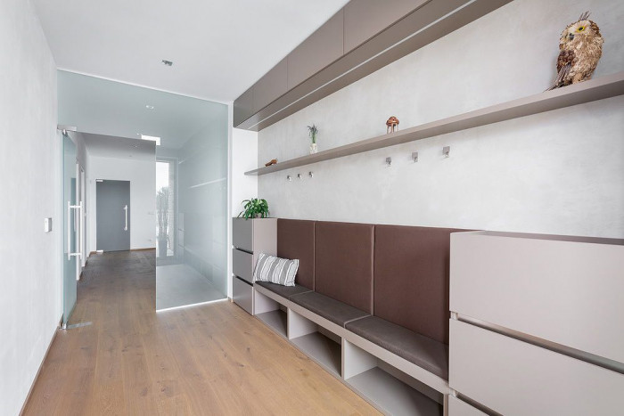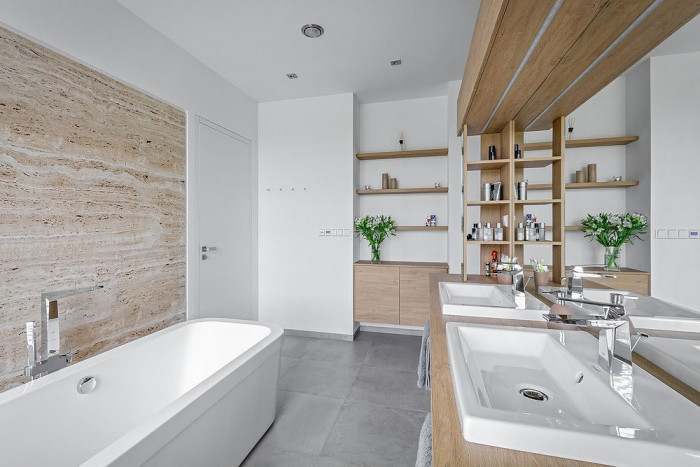Jemná přírodní barevnost přechází z exteriéru i do interiéru, kde je dominantní barvou bílá, doplněná béžovými a šedavými odstíny. Opět vnímáme kvalitu přírodních materiálů a čistou jednoduchost linií.