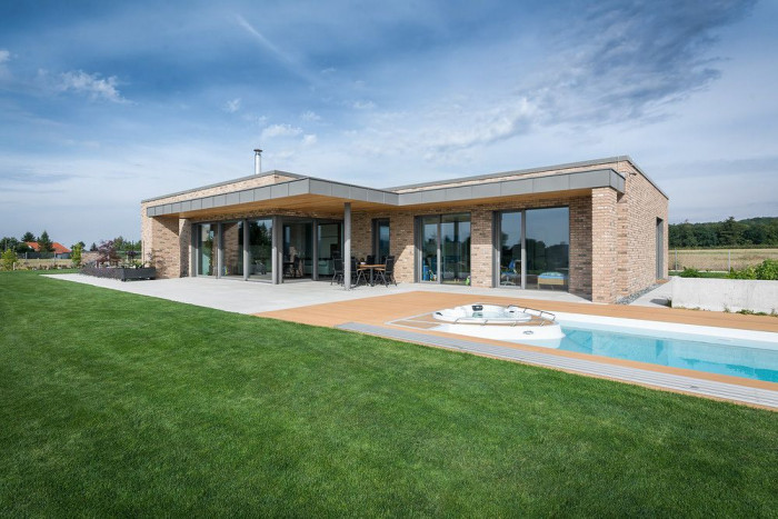 Rodinný dům navrhli autoři jako jednopodlažní nepodsklepený objekt s plochou střechou. Skládá se ze dvou hmot s plochými střechami, které se liší svojí výškou. To dodává půdorysně jednoduchému domu zajímavou dynamiku. Ve zvýšené hmotě je navržena vstupní hala a obytný prostor, v nižší hmotě pak nalezneme zádveří s šatnou, ateliér, technickou místnost, tři ložnice, šatnu a koupelnu rodičů i dětskou koupelnu.